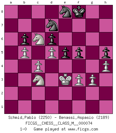 Last move : 1-0 2016 July 6 11:17:41 [Event "FICGS__CHESS__CLASS_M__000074"] [Site "FICGS"] [Date "2015.11.03"] [Round "1"] [White "Schmid,Pablo"] [Black "Benassi,Aspasio"] [Result "1-0"] [WhiteElo "2250"] [BlackElo "2189"] 1.d4 Nf6 2.c4 e6 3.Nf3 b6 4.g3 Bb4+ 5.Bd2 c5 6.Bg2 Bb7 7.O-O Na6 8.Bxb4 cxb4 9.Qa4 O-O 10.Nbd2 Qc7 11.Ne5 Bxg2 12.Kxg2 Qb7+ 13.Kg1 h6 14.Nd3 Rfc8 15.Rfc1 Nb8 16.Nxb4 a5 17.Nd3 Nc6 18.e3 d6 19.Qd1 Re8 20.b3 e5 21.d5 Nb4 22.Ne1 h5 23.e4 Qd7 24.a3 Na6 25.Kg2 g6 26.Qe2 Ra7 27.h4 Rea8 28.Rab1 Nc7 29.b4 axb4 30.axb4 Ra2 31.Nc2 Qc8 32.Ra1 Rxa1 33.Rxa1 Rxa1 34.Nxa1 Qb7 35.Nc2 Qa6 36.Qf3 Kg7 37.Qa3 Qxa3 38.Nxa3 Na6 39.Nc2 Nd7 40.Nb1 Nc7 41.f3 f5 42.exf5 gxf5 43.Nc3 Nf6 44.b5 Kf7 45.Nb4 Nce8 46.Nc6 Nd7 47.Kf2 Kf8 48.Ke3 1-0 Queen's Indian : 4.g3 Kingside Castling by player White (move 7) Kingside Castling by player Black (move 9) Player White won this chess game. Follow this game move after move (download)A thorough understanding of the typical mating continuations makes the most complicated sacrificial combinations leading up to them not only not difficult, but almost a matter of course. (Siegbert Tarrasch) Gewinnen beim Schach fördert das Selbstvertrauen. Beim Sex spüre ich sowas nicht... (Garry Kasparov) Muchos se han convertido en Maestros de Ajedrez, nadie se ha convertido en el Maestro del Ajedrez. (Siegbert Tarrasch) On peut tirer plus d'utilité d'une partie perdue que de 100 parties gagnées. (Capablanca) There are 10 types of people in this world: those who understand binary and those who don't. (Anonymous)