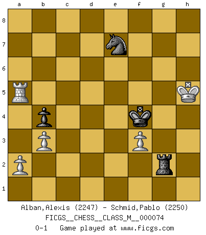 Last move : 0-1 2015 November 30 23:56:17 [Event "FICGS__CHESS__CLASS_M__000074"] [Site "FICGS"] [Date "2015.11.03"] [Round "1"] [White "Alban,Alexis"] [Black "Schmid,Pablo"] [Result "0-1"] [WhiteElo "2247"] [BlackElo "2250"] 1.d4 e6 2.e4 d5 3.Nd2 Nf6 4.Bd3 c5 5.e5 Nfd7 6.c3 Nc6 7.Ne2 cxd4 8.cxd4 f6 9.Nf4 Nxd4 10.Qh5+ Ke7 11.exf6+ Nxf6 12.Ng6+ hxg6 13.Qxh8 Kf7 14.O-O e5 15.Nf3 Nxf3+ 16.gxf3 e4 17.fxe4 Nh5 18.e5 Qh4 19.Bxg6+ Kxg6 20.Qxf8 Bf5 21.Qd6+ Kh7 22.Qxd5 Be4 23.Qd1 Rd8 24.Qe2 Bd3 25.Qf3 Rd4 26.h3 Be4 27.Qg4 Qxg4+ 28.hxg4 Bf3 29.Kh2 Rxg4 30.Kh3 g5 31.Bxg5 Rxg5 32.Kh4 Kh6 33.Rg1 Bg2 34.Rxg2 Rxg2 35.Rd1 Kg6 36.Rd7 b5 37.Rxa7 Nf4 38.b3 Kf5 39.f3 Nd5 40.Rb7 b4 41.Rb5 Kxe5 42.Ra5 Kf4 43.Kh5 Ne7 0-1 Queen's pawn Kingside Castling by player White (move 14) 10 pieces endgame at move 37 : White KRPPPP , Black KRNP WHITE : King + 1 Rook 4 Pawns BLACK : King + 1 Rook 1 Knight 1 Pawn 9 pieces endgame at move 41 : White KRPPP , Black KRNP WHITE : King + 1 Rook 3 Pawns BLACK : King + 1 Rook 1 Knight 1 Pawn Player Black won this chess game. Follow this game move after move (download)In the perfect Chess combination as in a first-rate short story, the whole plot and counter-plot should lead up to a striking finale, the interest not being allayed until the very last moment. (Yates and Winter) Frage: Wie viele Autos haben Sie schon zerstört? - Antwort: Nur zwei. (Loek van Wely) Ciertamente, de todas la drogas del mundo, el Ajedrez debe ser el mas placentero permamentemente. (Assiac) Les Echecs sont et restent toujours un combat, un combat intégral comme la boxe, la lutte ou un autre sport, et où il doit y avoir un vainqueur et un vaincu. (Joseph Emil Diemer) If only people were all showed a certain minimum level of niceness; if only people didn't retract verbal draw offers (without draw box ticked) on ficgs; if only people didn't kill; if only people didn't run concentration / extermination camps, if only people didn't drop nuclear bombs on Hiroshima and Nagasaki, and so on - it would be a much more beautiful world. But sadly, things are not so... (Normajean Yates)