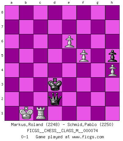 Last move : 0-1 2016 June 4 13:38:11 [Event "FICGS__CHESS__CLASS_M__000074"] [Site "FICGS"] [Date "2015.11.03"] [Round "1"] [White "Markus,Roland"] [Black "Schmid,Pablo"] [Result "0-1"] [WhiteElo "2248"] [BlackElo "2250"] 1.e4 e6 2.d4 d5 3.Nc3 Nf6 4.e5 Nfd7 5.f4 c5 6.Nf3 Nc6 7.Be3 a6 8.Qd2 Qb6 9.O-O-O Qc7 10.Kb1 b5 11.f5 c4 12.fxe6 fxe6 13.Be2 Nb6 14.Rdf1 b4 15.Nd1 Na4 16.Ng5 Rb8 17.Bg4 Qa5 18.Ka1 Be7 19.Bxe6 c3 20.Qf2 cxb2+ 21.Kb1 Kd8 22.Bxc8 Kxc8 23.Qf5+ Kb7 24.Qd7+ Kb6 25.Rf7 Rb7 26.Qe6 Rc7 27.Ne4 Kb7 28.Nc5+ Nxc5 29.dxc5 b3 30.cxb3 d4 31.Bf4 g5 32.Bxg5 Qxc5 33.Nxb2 Bxg5 34.Rxc7+ Kxc7 35.Nd3 Qb5 36.Rd1 Rd8 37.a4 Qd5 38.Qxd5 Rxd5 39.b4 h5 40.g3 a5 41.bxa5 Rxa5 42.Kb2 Rxa4 43.h4 Be3 44.Rf1 Rc4 45.Rf7+ Kb6 46.e6 Rc3 47.Nf4 Bc1+ 48.Kb1 Bxf4 49.gxf4 d3 50.Rd7 Kc5 51.Kb2 Rc2+ 52.Ka3 Kc4 53.Rc7 Rc3+ 54.Kb2 d2 55.Rxc6+ Kd5 56.Rxc3 d1Q 57.f5 Kd4 58.Rc1 Qd2+ 59.Kb1 Kd3 0-1 French : Steinitz, Boleslavsky variation Queenside Castling by player White (move 9) 10 pieces endgame at move 49 : White KRPPP , Black KRNPP WHITE : King + 1 Rook 3 Pawns BLACK : King + 1 Rook 1 Knight 2 Pawns 9 pieces endgame at move 55 : White KRPPP , Black KRPP WHITE : King + 1 Rook 3 Pawns BLACK : King + 1 Rook 2 Pawns 8 pieces endgame at move 56 : White KRPPP , Black KPP WHITE : King + 1 Rook 3 Pawns BLACK : King + 2 Pawns Promotion Queen by player Black (move 56) Player Black won this chess game. Follow this game move after move (download)Half the variations which are calculated in a tournament game turn out to be completely superfluous. Unfortunately, no one knows in advance which half. (Jan Tinman) Über Karpov: Er war und ist ein Vertreter der russischen Reaktionäre. Das steckt tief in seiner Seele, wehalb ich nicht nett mit ihm umgehen kann. (Viktor Kortschnoi) Siempre es mucho mejor sacrificar las piezas de tu oponente. (Savielly Tartakover) Le pion, dans sa simplicité, marche droit devant lui, mais lorsqu'il prend, il le fait obliquement? Ainsi l'homme, tant qu'il reste pauvre, marche dans la droiture et vit honnêtement, mais lorsqu'il recherche les honneurs, il flatte, se parjure et, par les voies obliques, cherche une position supérieure sur l'échiquier du monde. (Jean de Galles) Everybody lies. (Gregory House, House M.D.)