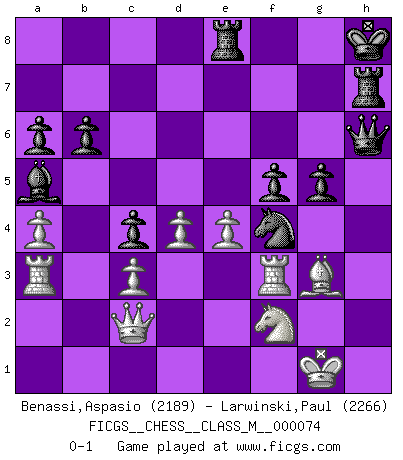 Last move : 0-1 2015 November 30 18:2:48 [Event "FICGS__CHESS__CLASS_M__000074"] [Site "FICGS"] [Date "2015.11.03"] [Round "1"] [White "Benassi,Aspasio"] [Black "Larwinski,Paul"] [Result "0-1"] [WhiteElo "2189"] [BlackElo "2266"] 1.b4 e5 2.Bb2 Bxb4 3.Bxe5 Nf6 4.c3 Ba5 5.e3 O-O 6.d4 d5 7.Bd3 Nbd7 8.Bf4 c5 9.Ne2 c4 10.Bc2 Nh5 11.Bd6 Re8 12.h3 Nf8 13.Bh2 Qg5 14.Kf1 Ng6 15.Nd2 Qe7 16.a4 Nf6 17.Qb1 b6 18.g4 Ne4 19.Bxe4 dxe4 20.Qb5 Be6 21.Bg3 Rac8 22.Kg1 Qb7 23.Rb1 Re7 24.Kh2 a6 25.Qb2 Qc6 26.Qa3 Rd7 27.Rhg1 h6 28.Qb2 Bd5 29.Ra1 Re8 30.Qc2 Rde7 31.Nf1 f6 32.Kh1 Ra7 33.Kh2 Ne7 34.Kh1 g5 35.Bh2 Bf7 36.Nd2 Nd5 37.Ra3 Kh8 38.Ng3 h5 39.gxh5 Nf4 40.Rf1 Bd5 41.f3 exf3 42.e4 Be6 43.Rxf3 Bxh3 44.Re3 Rae7 45.Kg1 Bg4 46.Nh1 Bxh5 47.Nf2 f5 48.Nf3 Bxf3 49.Rxf3 Rh7 50.Bg3 Qh6 0-1 Polish (Sokolsky) opening Kingside Castling by player Black (move 5) Player Black won this chess game. Follow this game move after move (download)I don't believe in psychology. I believe in good moves. (Bobby Fischer) Ein Kibitz ist einer, der deinem Gegner gute Ratschläge gibt. (Andrew Soltis) Alekhine es un poeta que crea un trabajo de arte de algo que raramente inspiraría a otra persona a mandar una tarjeta postal. (Max Euwe) Donnez-moi un Cavalier en 6e et je gagnerais toutes mes parties. (Steinitz) Waiting for chance ? Play in casinos. (FICGS proverb)