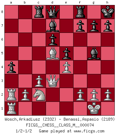 Last move : 1/2-1/2 2015 December 2 7:20:12 [Event "FICGS__CHESS__CLASS_M__000074"] [Site "FICGS"] [Date "2015.11.03"] [Round "1"] [White "Wosch,Arkadiusz"] [Black "Benassi,Aspasio"] [Result "1/2-1/2"] [WhiteElo "2332"] [BlackElo "2189"] 1.e4 c5 2.Nf3 Nc6 3.d4 cxd4 4.Nxd4 e5 5.Nb5 d6 6.N1c3 a6 7.Na3 b5 8.Nd5 Nf6 9.Bg5 Be7 10.Bxf6 Bxf6 11.c3 Bg5 12.Nc2 O-O 13.a4 bxa4 14.Rxa4 a5 15.Bc4 Ne7 16.O-O Nxd5 17.Bxd5 Bd7 18.Ra2 Rc8 19.Qd3 a4 20.Rfa1 Kh8 1/2-1/2 Sicilian : Labourdonnais-Loewenthal (Kalashnikov) variation Kingside Castling by player Black (move 12) Kingside Castling by player White (move 16) This chess game ended in a draw. Follow this game move after move (download)Personally, I rather look forward to a computer program winning the world Chess Championship. Humanity needs a lesson in humility. (Richard Dawkings) Ihnen, Herr Lasker, habe ich nur drei Worte zu sagen: Schach und matt. (Siegbert Tarrasch) Si un gobernante no entiende al Ajedrez, ¿como puede governar él un reinado?. (El Rey Khusros II) On n'a jamais que l'âge auquel on a commence à jouer aux échecs car après on cesse de vieillir. (Capablanca) A good book on your shelf is a friend that turns its back on you and remains a friend. (Author unknown)