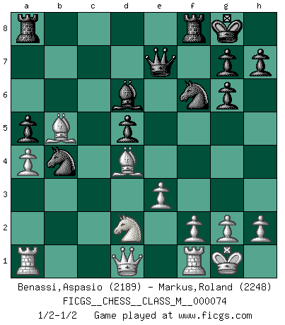 Last move : 1/2-1/2 2015 November 25 14:19:17 [Event "FICGS__CHESS__CLASS_M__000074"] [Site "FICGS"] [Date "2015.11.03"] [Round "1"] [White "Benassi,Aspasio"] [Black "Markus,Roland"] [Result "1/2-1/2"] [WhiteElo "2189"] [BlackElo "2248"] 1.b4 c6 2.a3 d5 3.Nf3 a5 4.b5 Bf5 5.e3 e6 6.Be2 Nf6 7.Nh4 Be4 8.d3 Bg6 9.bxc6 bxc6 10.Nd2 Nbd7 11.Bb2 Bd6 12.c4 O-O 13.Nxg6 fxg6 14.Qc2 Qe7 15.O-O e5 16.a4 Nb8 17.d4 exd4 18.Bxd4 Na6 19.cxd5 Nb4 20.Qd1 cxd5 21.Bb5 1/2-1/2 Polish : Outflank variation Kingside Castling by player Black (move 12) Kingside Castling by player White (move 15) This chess game ended in a draw. Follow this game move after move (download)Chess is a more highly symbolic game, but the aggressions are therefore even more frankly represented in the play. It probably began as a war game; that is, the representation of a miniature battle between the forces of two kingdoms. (Karl Meninger) Den Ruhm habe ich schon, jetzt brauche ich noch das Geld. (Wilhelm Steinitz) Hasta este punto, las blancas han seguido un análisis bien conocido. Pero ahora el hace un error fatal: empieza a usar su propia cabeza. (Siegbert Tarrasch) On croit qu'il y a plus de mauvais joueurs que de bons joueurs, c'est faux : Il y a autant de joueurs qui gagnent que de joueurs qui perdent. (Philippe Geluck) If you know the enemy and know yourself you need not fear the results of a hundred battles. (Sun Tzu)
