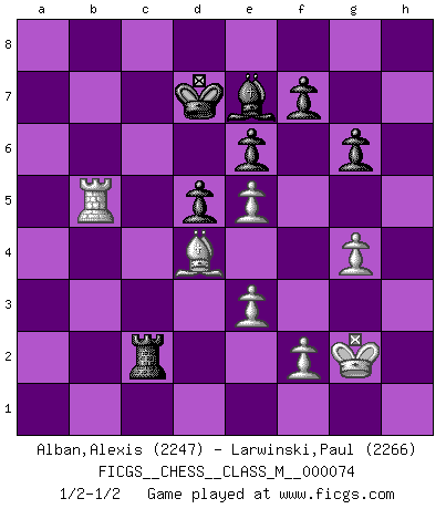 Last move : 1/2-1/2 2015 December 3 17:50:42 [Event "FICGS__CHESS__CLASS_M__000074"] [Site "FICGS"] [Date "2015.11.03"] [Round "1"] [White "Alban,Alexis"] [Black "Larwinski,Paul"] [Result "1/2-1/2"] [WhiteElo "2247"] [BlackElo "2266"] 1.d4 Nf6 2.c4 g6 3.g3 c6 4.Nf3 Bg7 5.b3 d5 6.Nbd2 O-O 7.Bb2 Bf5 8.Bg2 b5 9.O-O bxc4 10.bxc4 Nbd7 11.Rc1 Rb8 12.Bc3 Ne4 13.Nxe4 Bxe4 14.cxd5 cxd5 15.Ne5 Nxe5 16.dxe5 Bxg2 17.Kxg2 Rc8 18.Bd4 Qd7 19.Qd3 e6 20.Rfd1 Qa4 21.Qb3 Qd7 22.a4 Rb8 23.Qd3 Qxa4 24.Ra1 Qb3 25.Qxb3 Rxb3 26.Rxa7 Rc8 27.Rda1 Bf8 28.Rd7 Ba3 29.Ra2 h5 30.Be3 Kf8 31.h3 Ke8 32.Ra7 Be7 33.Bd4 Rb4 34.e3 Rbc4 35.Rb2 R4c7 36.Rxc7 Rxc7 37.Rb8+ Kd7 38.g4 hxg4 39.hxg4 Rc8 40.Rb7+ Rc7 41.Rb5 Rc2 1/2-1/2 King's Indian : 3.g3 Kingside Castling by player Black (move 6) Kingside Castling by player White (move 9) This chess game ended in a draw. Follow this game move after move (download)Chess is as much a mystery as women. (Purdy) Ein guter Spieler hat immer Glück. (José Raúl Capablanca) El Ajedrez es una hermosa aventura. (Bent Larsen) Il vaut mieux sacrifier les pièces de l'adversaire. (Xavier Tartacover) Children in the dark cause accidents, accidents in the dark cause children. (Unknown)