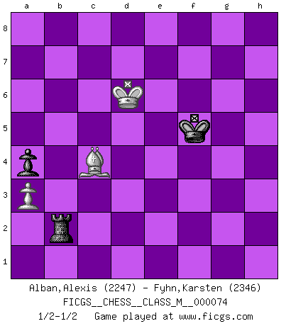 Last move : 1/2-1/2 2016 March 9 22:27:22 [Event "FICGS__CHESS__CLASS_M__000074"] [Site "FICGS"] [Date "2015.11.03"] [Round "1"] [White "Alban,Alexis"] [Black "Fyhn,Karsten"] [Result "1/2-1/2"] [WhiteElo "2247"] [BlackElo "2346"] 1.d4 Nf6 2.c4 g6 3.Nc3 Bg7 4.e4 d6 5.Nf3 O-O 6.h3 e5 7.d5 a5 8.Bg5 Na6 9.Be2 Qe8 10.g4 Bd7 11.Nd2 Kh8 12.Qc2 Ng8 13.O-O-O f5 14.exf5 gxf5 15.a3 a4 16.Kb1 Ne7 17.Nf1 Nc5 18.Ng3 Qf7 19.Nb5 Rac8 20.Rhe1 Bf6 21.Bxf6+ Qxf6 22.f4 Ng6 23.fxe5 Nxe5 24.Nd4 f4 25.Rf1 Rf7 26.Ngf5 Ng6 27.h4 Nxh4 28.Rxf4 Qe5 29.Ne6 Bxe6 30.dxe6 Rf6 31.Rf2 Qxe6 32.Rh2 Nxf5 33.gxf5 Qe4 34.Qxe4 Nxe4 35.Bf3 Nc5 36.Rdh1 h6 37.Bh5 Nd3 38.Bg6 Kg7 39.Kc2 Ne5 40.Rxh6 R6f8 41.Kc3 b6 42.R1h2 c6 43.Rh7+ Kf6 44.Kb4 d5 45.R2h6 c5+ 46.Kb5 Nxc4 47.Be8 Kg5 48.Bd7 Rcd8 49.Rh5+ Kf6 50.R7h6+ Ke7 51.Bc6 Nd6+ 52.Kxb6 Nxf5 53.Rg6 c4 54.R6g5 Ke6 55.Rxf5 Rxf5 56.Rxf5 Kxf5 57.Kc7 Rh8 58.Bxd5 Rh2 59.Kd6 Rxb2 60.Bxc4 1/2-1/2 King's Indian : 5.Nf3 Kingside Castling by player Black (move 5) Queenside Castling by player White (move 13) 10 pieces endgame at move 56 : White KRBPP , Black KRPPP WHITE : King + 1 Rook 1 Bishop 2 Pawns BLACK : King + 1 Rook 3 Pawns 9 pieces endgame at move 56 : White KBPP , Black KRPPP WHITE : King + 1 Bishop 2 Pawns BLACK : King + 1 Rook 3 Pawns 8 pieces endgame at move 58 : White KBPP , Black KRPP WHITE : King + 1 Bishop 2 Pawns BLACK : King + 1 Rook 2 Pawns 7 pieces endgame at move 59 : White KBP , Black KRPP WHITE : King + 1 Bishop 1 Pawn BLACK : King + 1 Rook 2 Pawns 6 pieces endgame at move 60 : White KBP , Black KRP WHITE : King + 1 Bishop 1 Pawn BLACK : King + 1 Rook 1 Pawn This chess game ended in a draw. Follow this game move after move (download)When you don't know what to play, wait for an idea to come into your opponent's mind. You may be sure that idea will be wrong. (Siegbert Tarrasch) Fischer: 'Remis!?' Uhlmann: 'Aber es muss doch dreimal Zugwiederholung sein!' Fischer: 'Sie nehmen das Remis an, wie ich es sage, sonst spiele ich weiter und werde Sie dann schlagen!' (Robert James Fischer) Un entendimiento minucioso de las típicas continuaciones de mate hacen de las mas complicadas combinaciones de sacrificio que conducen hacia ellas no solo no dificiles, sino casi un asunto de rutina. (Siegbert Tarrasch) On est toujours la mazette de quelqu'un d'autre. (Anonyme) Go and wake up your luck. (Persian saying)