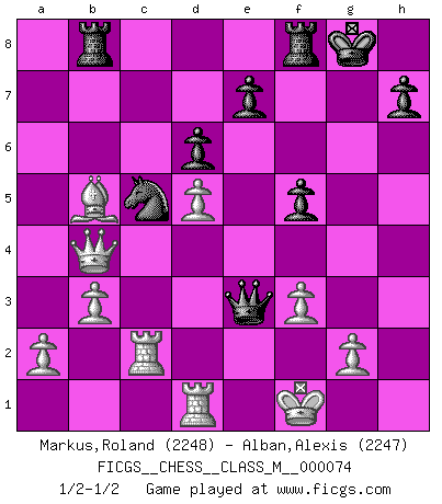 Last move : 1/2-1/2 2016 January 13 18:11:13 [Event "FICGS__CHESS__CLASS_M__000074"] [Site "FICGS"] [Date "2015.11.03"] [Round "1"] [White "Markus,Roland"] [Black "Alban,Alexis"] [Result "1/2-1/2"] [WhiteElo "2248"] [BlackElo "2247"] 1.e4 c5 2.Nf3 g6 3.d4 cxd4 4.Nxd4 Nc6 5.c4 d6 6.Be3 Bg7 7.Nc3 Nf6 8.Be2 O-O 9.O-O Bd7 10.Qd2 Nxd4 11.Bxd4 Bc6 12.f3 Nd7 13.Bf2 a5 14.Rfd1 Be5 15.Rac1 Nc5 16.b3 Rb8 17.Rc2 b6 18.Bg3 Qc8 19.Qe3 Bxg3 20.hxg3 Qe6 21.Nd5 Bxd5 22.cxd5 Qe5 23.g4 b5 24.Qd2 Qg3 25.Qxa5 b4 26.Bb5 f5 27.exf5 gxf5 28.g5 Qxg5 29.Qxb4 Qe3+ 30.Kf1 Qh6 31.Kg1 Qe3+ 32.Kf1 1/2-1/2 Sicilian : Hungarian variation Kingside Castling by player Black (move 8) Kingside Castling by player White (move 9) This chess game ended in a draw. Follow this game move after move (download)What would Chess be without silly mistakes ? (Kurt Richter) Bobby Fischer ist kein Vorbild für die heutige Jugend. (Viktor Kortschnoi) El Ajedrez demanda una total concentración. (Bobby Fischer) Dieu déplace le joueur, et celui-ci la pièce. Quel Dieu derrière Dieu commence donc la trame ? Arturo Perez-Reverte (prix de littérature policière 1993). Excelling at chess has long been considered a symbol of more general intelligence. That is an incorrect assumption in my view, as pleasant as it might be. But for the purposes of argument and investigation, chess is, in Russkin-Gutman's words, 'an unparalleled laboratory, since both the learning process and the degree of ability obtained can be objectified and quantified, providing an excellent comparative framework on which to use rigorous analytical techniques.' (The Chess Master and the Computer, by Garry Kasparov - 2010)