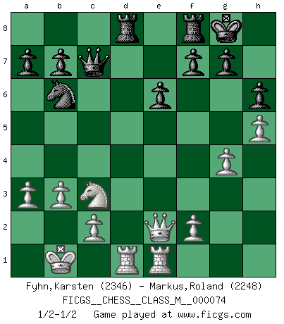 Last move : 1/2-1/2 2016 January 25 17:19:47 [Event "FICGS__CHESS__CLASS_M__000074"] [Site "FICGS"] [Date "2015.11.03"] [Round "1"] [White "Fyhn,Karsten"] [Black "Markus,Roland"] [Result "1/2-1/2"] [WhiteElo "2346"] [BlackElo "2248"] 1.e4 c6 2.d4 d5 3.Nc3 dxe4 4.Nxe4 Bf5 5.Ng3 Bg6 6.h4 h6 7.Nf3 Nd7 8.h5 Bh7 9.Bd3 Bxd3 10.Qxd3 e6 11.Bf4 Qa5+ 12.Bd2 Bb4 13.a3 Bxd2+ 14.Nxd2 Ngf6 15.O-O-O O-O 16.Nge4 Rad8 17.Kb1 Qc7 18.Qe2 c5 19.dxc5 Nxe4 20.Nxe4 Nxc5 21.Nc3 Nd7 22.g4 Qf4 23.Rhe1 Nb6 24.b3 Qc7 25.Kb2 Qf4 26.Kb1 Qc7 1/2-1/2 Caro-Kann : Classical, 7...Nd7 Queenside Castling by player White (move 15) Kingside Castling by player Black (move 15) This chess game ended in a draw. Follow this game move after move (download)I give 98 percent of my mental energy to Chess. Others give only 2 percent. (Bobby Fischer) Wenn ich gewinne bin ich ein Genie. Wenn nicht, dann bin ich keines. (Robert James Fischer) Por tratar de evitar la pérdida de una pieza, muchas personas han perdido una partida de Ajedrez. (Savielly Tartakover) On peut tirer plus d'utilité d'une partie perdue que de 100 parties gagnées. (Capablanca) Mac users swear by their computers. PC users swear at their computers. (Author unknown)