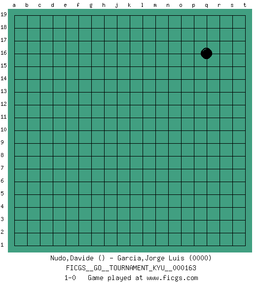 Last move : 1-0 2015 December 4 19:57:59 [Event "FICGS__GO__TOURNAMENT_KYU__000163"] [Site "FICGS"] [Date "2015.11.03"] [Round "1"] [Black "Nudo,Davide"] [White "Garcia,Jorge Luis"] [Result "1-0"] [Rating 2 "0000"] 1.q16 1-0 This go game has been lost on time (started : 2015.11.03 21:50:53) Here are the names of the openings (joseki) played in the four corners : Player Black won this Go (weiqi, baduk) game. Follow this game move after move (download)You don't have to be really good anymore to get good results. What's happening with chess is that it's gradually losing its place as the par excellence of intellectual activity. Smart people in search of a challenging board game might try a game called Go. (Hans Berliner, The New York Times, 2003) I believe in luck. How else can you explain the success of those you dislike ? (Jean Cocteau)