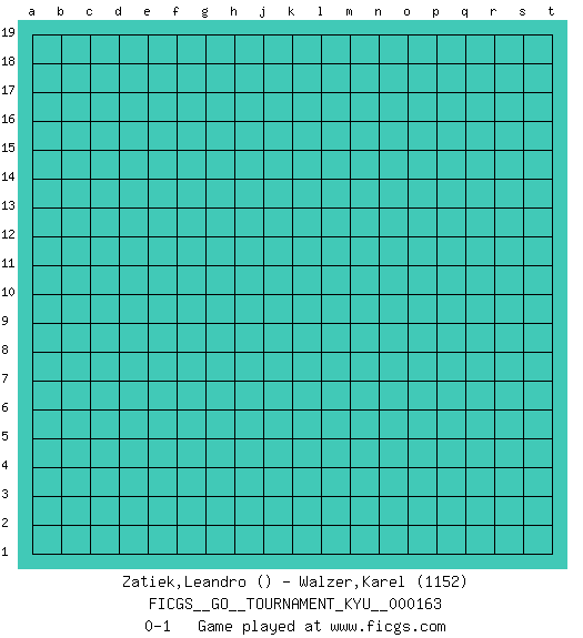 Last move : 0-1 2015 December 4 7:57:37 [Event "FICGS__GO__TOURNAMENT_KYU__000163"] [Site "FICGS"] [Date "2015.11.03"] [Round "1"] [Black "Zatiek,Leandro"] [White "Walzer,Karel"] [Result "0-1"] [Rating 2 "1152"] 0-1 This go game has been lost on time (started : 2015.11.03 21:50:53) Here are the names of the openings (joseki) played in the four corners : Player White won this Go (weiqi, baduk) game. Follow this game move after move (download)Dead group ? Always win ko fights ! (Anonymous) He who is a good ruler must first have been ruled. (Aristotle)