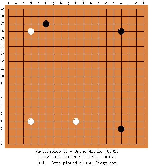 Last move : 0-1 2015 December 8 20:20:22 [Event "FICGS__GO__TOURNAMENT_KYU__000163"] [Site "FICGS"] [Date "2015.11.03"] [Round "1"] [Black "Nudo,Davide"] [White "Bromo,Alexis"] [Result "0-1"] [Rating 2 "0902"] 1.q16 d4 2.q3 d16 3.f17 k4 0-1 This go game has been lost on time (started : 2015.11.03 21:50:53) Here are the names of the openings (joseki) played in the four corners : Corner d16 : d16 f17 Hoshi (Hwajeom, Seongjeom, Xingwei`) 4-4 Point. The star or hoshi (4-4) point, emphasizing influence at the potential expense of territory. Ikken Kakari (Hankan Keolch'im, Yi Gua`jiao~, 1-Space Low Approach). Black 2 is the standard approach move to the 4-4. Player White won this Go (weiqi, baduk) game. Follow this game move after move (download)Win the stones, lose the game. (Anonymous) The difference between stupidity and genius is that genius has its limits. (Murphy)
