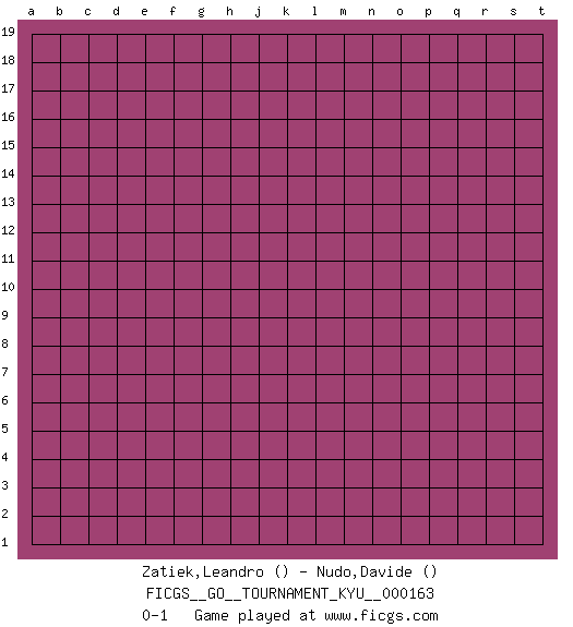 Last move : 0-1 2015 December 4 7:57:37 [Event "FICGS__GO__TOURNAMENT_KYU__000163"] [Site "FICGS"] [Date "2015.11.03"] [Round "1"] [Black "Zatiek,Leandro"] [White "Nudo,Davide"] [Result "0-1"] 0-1 This go game has been lost on time (started : 2015.11.03 21:50:53) Here are the names of the openings (joseki) played in the four corners : Player White won this Go (weiqi, baduk) game. Follow this game move after move (download)Strike at the waist of the knight's move. (Anonymous) When I took office, only high energy physicists had ever heard of what is called the World Wide Web... Now even my cat has its own page. (Bill Clinton, 1996)