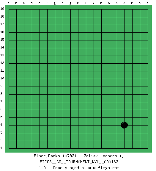 Last move : 1-0 2015 December 4 19:57:59 [Event "FICGS__GO__TOURNAMENT_KYU__000163"] [Site "FICGS"] [Date "2015.11.03"] [Round "1"] [Black "Pipac,Darko"] [White "Zatiek,Leandro"] [Result "1-0"] [Rating 1 "0793"] 1.q4 1-0 This go game has been lost on time (started : 2015.11.03 21:50:53) Here are the names of the openings (joseki) played in the four corners : Corner q4 : q4 1-0 Hoshi (Hwajeom, Seongjeom, Xingwei`) 4-4 Point. The star or hoshi (4-4) point, emphasizing influence at the potential expense of territory. Player Black won this Go (weiqi, baduk) game. Follow this game move after move (download)The enemy's vital point is your own. (Anonymous) It is not true that people stop pursuing dreams because they grow old, they grow old because they stop pursuing dreams. (Gabriel Garcia Marquez)