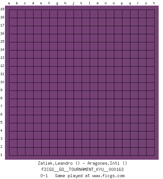 Last move : 0-1 2015 December 4 7:57:37 [Event "FICGS__GO__TOURNAMENT_KYU__000163"] [Site "FICGS"] [Date "2015.11.03"] [Round "1"] [Black "Zatiek,Leandro"] [White "Aragones,Inti"] [Result "0-1"] 0-1 This go game has been lost on time (started : 2015.11.03 21:50:53) Here are the names of the openings (joseki) played in the four corners : Player White won this Go (weiqi, baduk) game. Follow this game move after move (download)Go is to western chess what philosophy is to double entry accounting. (from Shibumi, by Trevanian) For a mechanic, you seem to do an excessive amount of thinking. (C-3PO in Star Wars ep.2)