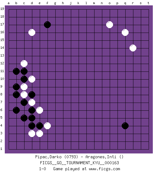 Last move : 1-0 2015 December 27 22:6:1 [Event "FICGS__GO__TOURNAMENT_KYU__000163"] [Site "FICGS"] [Date "2015.11.03"] [Round "1"] [Black "Pipac,Darko"] [White "Aragones,Inti"] [Result "1-0"] [Rating 1 "0793"] 1.q4 d16 2.d4 q16 3.f17 c6 4.d6 d7 5.c5 e3 6.e4 e6 7.d5 f4 8.c7 c8 9.b6 d3 10.b8 c9 11.b9 d10 12.b11 o17 13.c10 c12 14.c11 r14 15.d8 1-0 This go game has been lost on time (started : 2015.11.03 21:50:53) Here are the names of the openings (joseki) played in the four corners : Corner d16 : d16 f17 Hoshi (Hwajeom, Seongjeom, Xingwei`) 4-4 Point. The star or hoshi (4-4) point, emphasizing influence at the potential expense of territory. Ikken Kakari (Hankan Keolch'im, Yi Gua`jiao~, 1-Space Low Approach). Black 2 is the standard approach move to the 4-4. Corner d4 : d4 c6 Hoshi (Hwajeom, Seongjeom, Xingwei`) 4-4 Point. The star or hoshi (4-4) point, emphasizing influence at the potential expense of territory. Ikken Kakari (Hankan Keolch'im, Yi Gua`jiao~, 1-Space Low Approach). White 2 is the standard approach move to the 4-4. Player Black won this Go (weiqi, baduk) game. Follow this game move after move (download)The monkey jump is worth eight points. (Anonymous) Whatever you do, don't be bored. This is absolutely the most exciting time we could have possibly hoped to be alive. And things are just starting. (From movie Waking life)