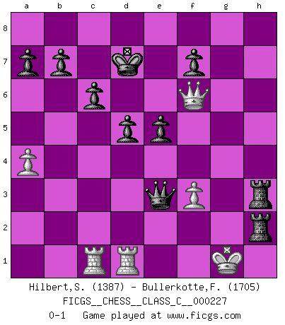 Last move : 0-1 2015 December 4 22:15:4 [Event "FICGS__CHESS__CLASS_C__000227"] [Site "FICGS"] [Date "2015.11.04"] [Round "1"] [White "Hilbert,Stephan J."] [Black "Bullerkotte,Frank"] [Result "0-1"] [WhiteElo "1387"] [BlackElo "1705"] 1.b3 d5 2.Bb2 Bg4 3.Nf3 Nf6 4.e3 Nbd7 5.h3 Bxf3 6.Qxf3 c6 7.g4 e5 8.d3 Qa5+ 9.Nd2 Bb4 10.Qd1 Bc3 11.Bxc3 Qxc3 12.Bg2 O-O-O 13.a4 g5 14.O-O h5 15.gxh5 Rdg8 16.Nf3 g4 17.hxg4 Rxg4 18.Nh2 Rg7 19.Qf3 Qxc2 20.Rac1 Qxb3 21.Kh1 Rxh5 22.Bh3 Rgh7 23.Bxd7+ Kxd7 24.Qxf6 Rxh2+ 25.Kg1 Qxd3 26.Rfd1 Rh1+ 27.Kg2 Qe4+ 28.f3 R7h2+ 29.Kg3 Rh3+ 30.Kg2 R1h2+ 31.Kg1 Qxe3+ 0-1 Nimzovich-Larsen attack : Classical variation Queenside Castling by player Black (move 12) Kingside Castling by player White (move 14) Player Black won this chess game. Follow this game move after move (download)Chess is a sea in which a gnat may drink and an elephant may bathe. (Hindu proverb) Fischer: 'Remis!?' Uhlmann: 'Aber es muss doch dreimal Zugwiederholung sein!' Fischer: 'Sie nehmen das Remis an, wie ich es sage, sonst spiele ich weiter und werde Sie dann schlagen!' (Robert James Fischer) Bobby Fischer es el mas grande genio de Ajedrez de todos los tiempos. (Alexander Kotov) Mais l'homme est une créature légère et illogique : semblable au joueur d'échecs, il n'aime que le processus du but à atteindre, non le but lui-même. (Dostoïevsky) Never risk one's whole fortune unless supported by one's entire army. (Niccolo Machiavelli)