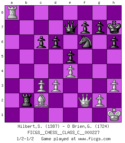 Last move : 1/2-1/2 2015 December 4 4:50:0 [Event "FICGS__CHESS__CLASS_C__000227"] [Site "FICGS"] [Date "2015.11.04"] [Round "1"] [White "Hilbert,Stephan J."] [Black "O Brien,Glenn"] [Result "1/2-1/2"] [WhiteElo "1387"] [BlackElo "1724"] 1.e4 e5 2.Nf3 Nc6 3.Bc4 Nf6 4.d3 Bc5 5.Bg5 h6 6.Bh4 d6 7.O-O O-O 8.Nc3 Bg4 9.h3 Bxf3 10.Qxf3 Nd4 11.Qd1 c6 12.a3 b5 13.Ba2 a5 14.Ne2 b4 15.axb4 axb4 16.c3 Nxe2+ 17.Qxe2 Qe7 18.Qg4 b3 19.Bxb3 Bxf2+ 20.Kh1 Rxa1 21.Rxa1 Bxh4 22.Qxh4 Rb8 23.Bc2 Rxb2 24.Ra8+ Kh7 25.Qf2 1/2-1/2 Two knights defense (Modern Bishop's Opening) Kingside Castling by player White (move 7) Kingside Castling by player Black (move 7) This chess game ended in a draw. Follow this game move after move (download)Man is a frivolous, a specious creature, and like a Chess player, cares more for the process of attaining his goal than for the goal itself. (Dostoyevsky) Es ist schade, dass viele Schachsportler vergessen, wie wichtig Auftreten und angemessene Kleidung sind. (Alexandra Kosteniuk) Ser exitoso en el Ajedrez te permite descubrir tu propia personalidad. Eso es lo que deseo para los niños de mi clase. (Saudin Robovic) On a dit que l'homme se distingue de l'animal par le fait qu'il achète plus de livres qu'il ne peut en lire. Je voudrais suggérer qu'inclure à la liste des livres quelques livres d'échecs rendrait la distinction manifeste. (Edward Lasker) SEO proverb : Make your website optimized for human beings, not for search engines.