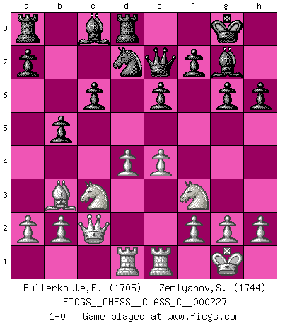 Last move : 1-0 2016 March 10 18:6:43 [Event "FICGS__CHESS__CLASS_C__000227"] [Site "FICGS"] [Date "2015.11.04"] [Round "1"] [White "Bullerkotte,Frank"] [Black "Zemlyanov,Sergey"] [Result "1-0"] [WhiteElo "1705"] [BlackElo "1744"] 1.d4 d5 2.c4 c6 3.Nf3 Nf6 4.Nc3 e6 5.Bg5 h6 6.Bxf6 Qxf6 7.e3 Nd7 8.Bd3 dxc4 9.Bxc4 g6 10.O-O Bg7 11.Qc2 O-O 12.Rad1 Qe7 13.Rfe1 Rd8 14.Bb3 b5 15.e4 1-0 This chess game has been lost on time (started : 2015.11.04 7:58:57) QGD Slav : 4.Nc3 Kingside Castling by player White (move 10) Kingside Castling by player Black (move 11) Player White won this chess game. Follow this game move after move (download)You sit at the board and suddenly your heart leaps. Your hand trembles to pick up the piece and move it. But what Chess teaches you is that you must sit there calmly and think about whether it's really a good idea and whether there are other better ideas. (Stanley Kubrick) Die Fehler sind da, Sie warten nur darauf gemacht zu werden. (Savielly Grigorievitsch Tartakower) El jugador táctico debe saber que hacer cuando algo se debe de hacer. El estratégico debe saber que hacer cuando nada se debe de hacer. (Savielly Tartakover) Les Echecs mettent en conflit, non pas deux intelligences, mais deux volontés. (Lasker) All politicians must be presumed guilty until they are proven innocent. (Dinesh De Silva)