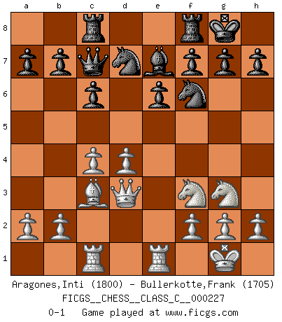 Last move : 0-1 2016 January 17 23:45:53 [Event "FICGS__CHESS__CLASS_C__000227"] [Site "FICGS"] [Date "2015.11.04"] [Round "1"] [White "Aragones,Inti"] [Black "Bullerkotte,Frank"] [Result "0-1"] [WhiteElo "1800"] [BlackElo "1705"] 1.e4 c6 2.d4 d5 3.Nc3 dxe4 4.Nxe4 Bf5 5.Ng3 Bg6 6.Nf3 Nd7 7.Bd3 Bxd3 8.Qxd3 Ngf6 9.O-O e6 10.Re1 Qa5 11.Bd2 Qc7 12.c4 Be7 13.Rac1 Rc8 14.Bc3 O-O 0-1 Caro-Kann : Classical variation Kingside Castling by player White (move 9) Kingside Castling by player Black (move 14) Player Black won this chess game. Follow this game move after move (download)The most powerful weapon in Chess is to have the next move. (David Bronstein) Ich bin es gewohnt, das die Jugend mir überhaupt keinen Respekt entgegenbringt. (Alexander Morozewich) Una compensación adecuada por un sacrificio es tener una combinación sólida que conduce a una posición ganadora; una compensación adecuada por una metida de pata es dejar a tu oponente arrebatar una derrota de las fauces de la victoria. (Bruce A. Moon) Echiquier : carré parfait, comme la Jérusalem nouvelle décrite par l'auteur de l'Apocalypse, huit cases sur huit, exaltation du chiffre 4, symbole du cosmos aux quatre horizons... où le noir et le blanc, l'ombre et la lumière, le mal et le bien s'entremêlent et se conjuguent. (Robert Couffignal, Le Gambit du poète) If things go wrong, don't go with them. (Roger Babson)