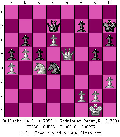 Last move : 1-0 2015 December 15 22:10:43 [Event "FICGS__CHESS__CLASS_C__000227"] [Site "FICGS"] [Date "2015.11.04"] [Round "1"] [White "Bullerkotte,Frank"] [Black "Rodriguez Perez,Rene"] [Result "1-0"] [WhiteElo "1705"] [BlackElo "1739"] 1.d4 e6 2.c4 d5 3.Nc3 Nf6 4.Bg5 Nbd7 5.Nf3 Bb4 6.cxd5 exd5 7.Qc2 c5 8.e3 Qe7 9.Be2 h6 10.Bh4 b6 11.O-O Bxc3 12.bxc3 Bb7 13.Nd2 a5 14.Bb5 g5 15.Bg3 O-O 16.Rfe1 Qe6 17.c4 Bc6 18.e4 Bxb5 19.exd5 Qg4 20.cxb5 Qxd4 21.Nc4 Rae8 22.Red1 Qe4 23.Qb3 Ra8 24.a4 Ra7 25.Nd6 Qg6 26.Re1 Nh5 27.Nc4 Ng7 28.Rad1 Re8 29.Rxe8+ Nxe8 30.Re1 Ng7 31.h3 Nf5 32.d6 Kh7 33.Qd1 Qf6 34.Be5 Nxe5 35.Rxe5 Nd4 36.Qe1 Rd7 37.Re7 Qf5 38.Rxd7 Qxd7 39.Qe5 1-0 Queen's pawn Kingside Castling by player White (move 11) Kingside Castling by player Black (move 15) Player White won this chess game. Follow this game move after move (download)Chess is like war on a board. (Bobby Fischer) Das Schachspiel ist ein See, in welchem eine Mücke baden und ein Elefant ertrinken kann. (Emanuel Lasker) Solo los afeminados hacen el Enroque. (Rob Sillars) Le plus grand jeu de l'esprit jamais inventé, plus vous l'apprenez, plus vous y prenez du plaisir. (Garry Kasparov) If you ain't just a little scared when you enter a casino, you are either very rich or you haven't studied the games enough. (Pappy)
