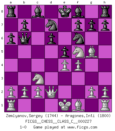Last move : 1-0 2015 December 27 10:6:5 [Event "FICGS__CHESS__CLASS_C__000227"] [Site "FICGS"] [Date "2015.11.04"] [Round "1"] [White "Zemlyanov,Sergey"] [Black "Aragones,Inti"] [Result "1-0"] [WhiteElo "1744"] [BlackElo "1800"] 1.e4 c5 2.Nf3 d6 3.d4 cxd4 4.Nxd4 Nf6 5.Nc3 a6 6.Bg5 Nbd7 7.f4 e5 8.Nf5 Qb6 9.Qd2 1-0 This chess game has been lost on time (started : 2015.11.04 7:58:57) Sicilian : Najdorf, 6.Bg5 Player White won this chess game. Follow this game move after move (download)Fischer Chess play was always razor-sharp, rational and brilliant. One of the best ever. (Dave Regis) Mit Schach schule ich mein Gefühl für Geometrie, was für Tennis und Schach gleichermaßen wichtig ist. (Boris Becker) Nos gusta pensar. (Gary Kasparov) La guerre est enfant de la passion, la passion est enfant du narcissisme et le narcissisme est l'enfant. (...) Une autre partie ? (Thibault de Vassal) The faster the computer, the slower the brain. (Thibault de Vassal)