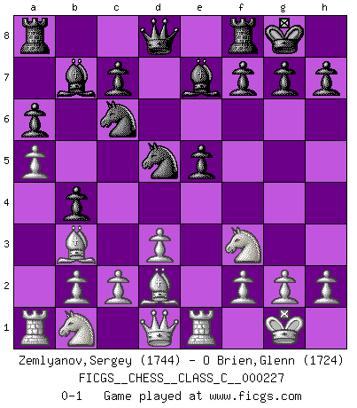 Last move : 0-1 2016 March 1 17:19:55 [Event "FICGS__CHESS__CLASS_C__000227"] [Site "FICGS"] [Date "2015.11.04"] [Round "1"] [White "Zemlyanov,Sergey"] [Black "O Brien,Glenn"] [Result "0-1"] [WhiteElo "1744"] [BlackElo "1724"] 1.e4 e5 2.Nf3 Nc6 3.Bb5 a6 4.Ba4 Nf6 5.O-O Be7 6.Re1 b5 7.Bb3 O-O 8.d3 d6 9.a4 Bb7 10.Bd2 b4 11.a5 d5 12.exd5 Nxd5 0-1 This chess game has been lost on time (started : 2015.11.04 7:58:57) Ruy Lopez : Closed, 7...O-O Kingside Castling by player White (move 5) Kingside Castling by player Black (move 7) Player Black won this chess game. Follow this game move after move (download)Strategy requires thought, tactics require observation. (Max Euwe) Über die Verhaftung Bobby Fischers: Warum es die Bush-Administration für nötig befindet einen 61 Jahre alten Mann zu hetzten, der für niemanden ausser sich selbste eine Gefahr darstellt ist ein Rätsel. (Nigel Short) En la vida, como en el Ajedrez, los Peones propios obstruyen nuestro camino. La gran fortuna de un hombre, su comodidad, placer, hijos, libros, que deberían ayudarle a ganar, con mucha frecuencia lo ponen en Jaque Mate. (Charles Buxton) La tactique est l'élément le plus important du milieu de jeu. (Siegbert Tarrasch) What doesn't kill us makes us stronger. (Friedrich Nietzsche)