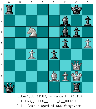 Last move : 0-1 2015 December 2 13:48:33 [Event "FICGS__CHESS__CLASS_D__000224"] [Site "FICGS"] [Date "2015.11.04"] [Round "1"] [White "Hilbert,Stephan J."] [Black "Ramos,Francis"] [Result "0-1"] [WhiteElo "1387"] [BlackElo "1513"] 1.e4 c5 2.b4 cxb4 3.a3 g6 4.Bb2 Nf6 5.axb4 d6 6.c4 Bg7 7.Qf3 O-O 8.d4 Qc7 9.Bd3 b6 10.h3 Bb7 11.Nd2 Nbd7 12.Qe2 a5 13.bxa5 bxa5 14.Ngf3 Rfb8 15.O-O Nh5 16.Qe3 a4 17.Bc3 a3 18.g4 Nhf6 19.e5 Ne8 20.Ne4 dxe5 21.d5 f6 22.Bb4 Bxd5 23.Bxe7 Bf7 24.h4 a2 25.g5 f5 26.Nf6+ Nexf6 27.gxf6 Nxf6 28.Bxf6 Bxf6 29.Be2 e4 30.Nd4 Qe5 31.Nc6 Qxa1 32.Rxa1 Rb1+ 33.Kg2 Rxa1 34.Qb3 Rb1 35.Qg3 a1Q 36.h5 Rg1+ 0-1 Sicilian : wing gambit, Marshall variation Kingside Castling by player Black (move 7) Kingside Castling by player White (move 15) Promotion Queen by player Black (move 35) Player Black won this chess game. Follow this game move after move (download)In Chess, at least, the brave inherit the earth. (Edmar Mednis) Woher wissen wir, daß der Neanderthaler Blindschach gespielt hat? -- Bei Ausgrabungen wurden keine Schachbretter und Figuren gefunden. (Anonymous) Una buena ofensiva y una buena defensa, comienzan ambas con un buen desarrollo. (Bruce A. Moon) Ce qui caractérise les parties de combat, c'est que si le défenseur a constamment de difficiles problèmes à résoudre, l'attaquant doit chercher sans relâche de nouvelles possibilités d'attaque. (Koblentz) They say poker is a zero-sum game. It must be, because every time I play my sum ends up zero. (Max Shapiro)