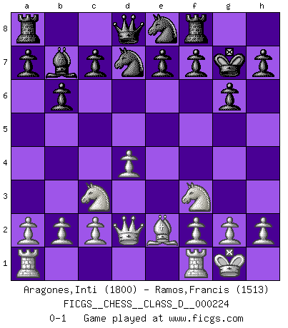 Last move : 0-1 2016 January 18 23:55:41 [Event "FICGS__CHESS__CLASS_D__000224"] [Site "FICGS"] [Date "2015.11.04"] [Round "1"] [White "Aragones,Inti"] [Black "Ramos,Francis"] [Result "0-1"] [WhiteElo "1800"] [BlackElo "1513"] 1.d4 Nf6 2.Nf3 g6 3.Nc3 Bg7 4.e4 d6 5.Be2 O-O 6.O-O b6 7.e5 Ne8 8.Bf4 Bb7 9.Qd2 dxe5 10.Bxe5 Nd7 11.Bxg7 Kxg7 0-1 King's Indian : East Indian defense Kingside Castling by player Black (move 5) Kingside Castling by player White (move 6) Player Black won this chess game. Follow this game move after move (download)When you play Bobby, it is not a question if you win or lose. It is a question if you survive. (Boris Spassky) Du musst Deinen Gegner in einen tiefen dunklen Wald führen wo 2+2=5 ist und wo der Weg, der wieder hinausführt, nur breit genug für einen ist. (Mikhail Nekhemyevich Tal) Con el fin de mejorar tu juego, debes de estudiar los finales antes que todo, ya que mientras que los finales pueden ser estudiados y dominados por sí mismos, el juegomedio y la apertura deben de ser estudiados en relación con los finales. (José Raúl Capablanca) Il n'y a plus de joueurs du niveau de Jacob Murray dont la seule quête est le beau jeu, le plaisir de voir les pièces construire quelque chose. Sur 10 idées à la minute, 9 seront sans intérêt, la dernière s'avèrera géniale. (Christian Bauer) Before all elsed, be armed. (Niccolo Machiavelli)