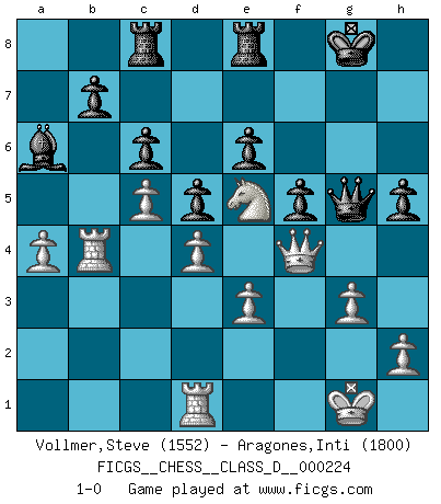 Last move : 1-0 2016 January 22 0:3:7 [Event "FICGS__CHESS__CLASS_D__000224"] [Site "FICGS"] [Date "2015.11.04"] [Round "1"] [White "Vollmer,Steve"] [Black "Aragones,Inti"] [Result "1-0"] [WhiteElo "1552"] [BlackElo "1800"] 1.d4 Nf6 2.c4 e6 3.Nf3 d5 4.Nc3 Nc6 5.Bg5 Be7 6.e3 O-O 7.Rc1 Re8 8.Bd3 Nb4 9.c5 Nxd3+ 10.Qxd3 h6 11.Bf4 a6 12.O-O Nh5 13.Ne2 Nxf4 14.Nxf4 Bd7 15.Qc3 Bf6 16.Nd3 Bb5 17.Rfd1 a5 18.Nde5 Bxe5 19.Nxe5 c6 20.Qc2 Rc8 21.a4 Ba6 22.f4 f5 23.Qf2 Qe7 24.Rb1 g5 25.g3 Qg7 26.b4 axb4 27.Rxb4 h5 28.fxg5 Qxg5 29.Qf4 1-0 Queen's pawn game Kingside Castling by player Black (move 6) Kingside Castling by player White (move 12) Player White won this chess game. Follow this game move after move (download)I give 98 percent of my mental energy to Chess. Others give only 2 percent. (Bobby Fischer) Schach ist Leben. (Robert James Fischer) El arma más poderosa en el Ajedrez, es tener la próxima movida. (David Bronstein) Plusieurs personnes se sont demandées comment Tal faisait pour gagner... En fait, c'est très simple ! Il met ses pièces au centre de l'échiquier et les sacrifie quelque part ! (David Bronstein) The problem with troubleshooting is that trouble shoots back. (Anonymous)