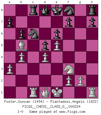 Last move : 1-0 2015 December 6 21:23:49 [Event "FICGS__CHESS__CLASS_D__000224"] [Site "FICGS"] [Date "2015.11.04"] [Round "1"] [White "Foster,Duncan"] [Black "Piantadosi,Angelo"] [Result "1-0"] [WhiteElo "1494"] [BlackElo "1422"] 1.e4 e6 2.d4 d5 3.e5 c5 4.c3 Nc6 5.Nf3 Qb6 6.a3 Bd7 7.b4 cxd4 8.cxd4 Nge7 9.Nc3 Ng6 10.h4 Be7 11.h5 Nf8 12.Na4 Qd8 13.Nc5 b6 14.Nxd7 Nxd7 15.Bb5 Rc8 16.h6 gxh6 17.Bxh6 Bf8 18.Bxf8 Nxf8 19.Rc1 1-0 French : Advance, Paulsen attack Player White won this chess game. Follow this game move after move (download)Though most people love to look at the games of the great attacking masters, some of the most successful players in history have been the quiet positional players. They slowly grind you down by taking away your space, tying up your pieces, and leaving you with virtually nothing to do ! (Yasser Seirawan) Nicht daß Diemer aus Opportunismus Mitglied der NSDAP geworden wäre. Er war ein Fanatiker, in allem, was er tat. (Hans Ree) Un buen sacrificio es aquel que aunque no sea necesariamente sólido, deja a tu oponente aturdido y confuso. (Rudolph Spielmann) Echiquier : carré parfait, comme la Jérusalem nouvelle décrite par l'auteur de l'Apocalypse, huit cases sur huit, exaltation du chiffre 4, symbole du cosmos aux quatre horizons... où le noir et le blanc, l'ombre et la lumière, le mal et le bien s'entremêlent et se conjuguent. (Robert Couffignal, Le Gambit du poète) If only people were all showed a certain minimum level of niceness; if only people didn't retract verbal draw offers (without draw box ticked) on ficgs; if only people didn't kill; if only people didn't run concentration / extermination camps, if only people didn't drop nuclear bombs on Hiroshima and Nagasaki, and so on - it would be a much more beautiful world. But sadly, things are not so... (Normajean Yates)