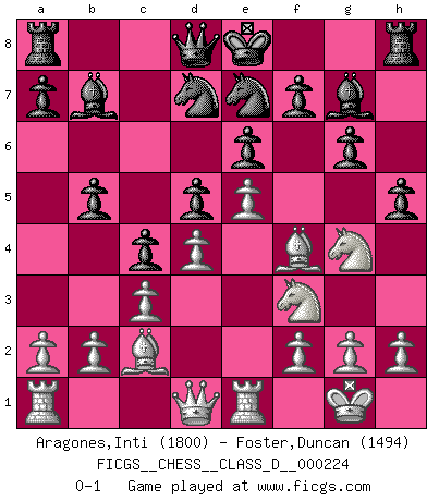 Last move : 0-1 2016 January 17 23:45:53 [Event "FICGS__CHESS__CLASS_D__000224"] [Site "FICGS"] [Date "2015.11.04"] [Round "1"] [White "Aragones,Inti"] [Black "Foster,Duncan"] [Result "0-1"] [WhiteElo "1800"] [BlackElo "1494"] 1.d4 b6 2.e4 Bb7 3.Bd3 e6 4.Nf3 h6 5.O-O g6 6.Bf4 d6 7.Nbd2 Bg7 8.e5 d5 9.Re1 Ne7 10.Nf1 Nd7 11.Ne3 c5 12.c3 c4 13.Bc2 b5 14.Ng4 h5 0-1 Queen's pawn : English defense Kingside Castling by player White (move 5) Player Black won this chess game. Follow this game move after move (download)Chess mastery essentially consists of analyzing Chess positions accurately. (Mikhail Botvinnik) Meine Liebe ist Schach, Schach, Schach. Ich muss jeden Tag Schach spielen, deshalb fühle ich mich so stark. (Miguel Najdorf) No soy una persona materialista y por eso, no resiento la falta o pérdida del dinero. La ausencia de cosas mundanas carece de importancia. Ya que el Ajedrez es una forma en la que puedo ser tan materialista como yo desee sin tener la necesidad de vender mi alma. (Jamie Walter Adams) L'attaque fait le spectacle, la défense gagne les matchs. (Dicton footballistique) Lottery : A tax on people who are bad at math. (Author unknown)