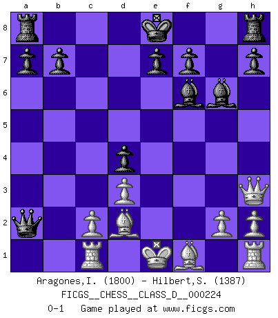Last move : 0-1 2016 January 17 23:45:53 [Event "FICGS__CHESS__CLASS_D__000224"] [Site "FICGS"] [Date "2015.11.04"] [Round "1"] [White "Aragones,Inti"] [Black "Hilbert,Stephan J."] [Result "0-1"] [WhiteElo "1800"] [BlackElo "1387"] 1.e4 d5 2.exd5 Qxd5 3.Nc3 Qa5 4.d3 Nf6 5.Bd2 c6 6.Nf3 Bf5 7.Ne4 Qb6 8.Nxf6+ gxf6 9.Bc3 Bh6 10.Qe2 Nd7 11.Nd4 Bg6 12.Qg4 Ne5 13.Qh3 Bg7 14.f4 c5 15.fxe5 cxd4 16.exf6 Bxf6 17.Bd2 Qxb2 18.Rc1 Qxa2 0-1 Scandinavian (centre counter) defense Player Black won this chess game. Follow this game move after move (download)It is not enough to be a good player... you must also play well. (Siegbert Tarrasch) Modernes Schach sorgt sich zuviel um Dinge wie Bauernstruktur usw. Vergessen Sie das, Schachmatt beendet das Spiel! (Nigel Short) El Ajedrez es el arte del análisis. (Mikhail Botvinnik) Il vaut toujours mieux jouer un plan faux de façon logique que de n'avoir pas de plan du tout. (Victor Kortchnoï) Without deviation from the norm, progress is not possible. (Frank Zappa)