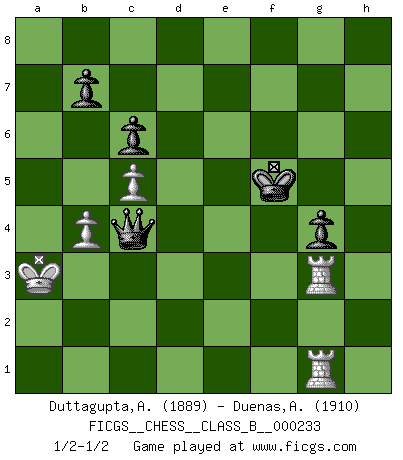 Last move : 1/2-1/2 2015 December 12 20:59:2 [Event "FICGS__CHESS__CLASS_B__000233"] [Site "FICGS"] [Date "2015.11.05"] [Round "1"] [White "Duttagupta,Aniruddha"] [Black "Duenas,Alexis"] [Result "1/2-1/2"] [WhiteElo "1889"] [BlackElo "1910"] 1.c4 e5 2.g3 Nc6 3.Nc3 f5 4.Nf3 Nf6 5.d4 e4 6.Nh4 g6 7.Bg5 Bg7 8.Qd2 O-O 9.Bg2 d6 10.O-O-O Qe8 11.f3 Qf7 12.b3 exf3 13.exf3 Nxd4 14.Qxd4 Ne4 15.fxe4 Bxd4 16.Rxd4 Qg7 17.Rd3 fxe4 18.Bxe4 c6 19.Re1 Bg4 20.Nf3 Rae8 21.Bf4 Rf6 22.Kb2 Bf5 23.Kc2 Qf8 24.Nd4 Kg7 25.Re2 Bg4 26.Red2 a6 27.h4 Rxf4 28.gxf4 Qxf4 29.Nde2 Qh6 30.Rxd6 Qxh4 31.Bd3 Qg5 32.Ne4 Qe5 33.N2c3 h5 34.Rg2 Re7 35.a3 Be6 36.c5 h4 37.Nf2 Bf5 38.Bxf5 Qxf5+ 39.Nce4 h3 40.Rg5 Qf7 41.Rd3 Rxe4 42.Nxe4 Qf4 43.Rxh3 Qxe4+ 44.Rd3 Kf6 45.R5g3 g5 46.b4 g4 47.Kb3 Kf5 48.Rd1 a5 49.Rdg1 axb4 50.axb4 Qd5+ 51.Ka3 Qc4 1/2-1/2 English Opening Kingside Castling by player Black (move 8) Queenside Castling by player White (move 10) 10 pieces endgame at move 50 : White KRRPP , Black KQPPP WHITE : King + 2 Rooks 2 Pawns BLACK : King + 1 Queen 3 Pawns This chess game ended in a draw. Follow this game move after move (download)Chess teaches you to control the initial excitement you feel when you see something that looks good and it trains you to think objectively when you're in trouble. (Stanley Kubrick) Weshalb minderdergeübte Spieler mit g2-g4 beginnen? Die betreffenden sind unschlüssig, ob sie nun rechts (h4) oder links (f4) beginnen sollen, und in ihrer Ratlosigkeit entschliessen sie sich nach guter Bürgerart dazu, den goldenen Mittelweg zu wählen. (Aaron Nimzowitsch) Desconfianza es la característica mas necesaria de un jugador de Ajedrez. (Siegbert Tarrasch) J'ai vu le vaincu d'Echecs jouer des années durant dans l'espoir de la fête de la victoire. Car tu es plus riche de ce qu'elle existe si même elle n'est point pour toi. Ainsi de la perle du fond des mers. (Antoine de Saint-Exupéry) Unless in communicating with it one says exactly what one means, trouble is bound to result. (Alan Turing, about computers)