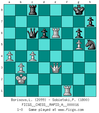 Last move : 1-0 2007 June 15 13:38:10 [Event "FICGS__CHESS__RAPID_A__000016"] [Site "FICGS"] [Date "2007.03.15"] [Round "1"] [White "Borisovs,Leonids"] [Black "Sobietski,Piotr"] [Result "1-0"] [WhiteElo "2099"] [BlackElo "1800"] 1.e4 c5 2.Nf3 d6 3.d4 cxd4 4.Nxd4 Nf6 5.Nc3 g6 6.Be3 Bg7 7.f3 O-O 8.Bc4 Nc6 9.Qd2 Bd7 10.O-O-O Rc8 11.Bb3 Ne5 12.Kb1 Nc4 13.Bxc4 Rxc4 14.g4 b5 15.b3 Rc8 16.Ndxb5 a6 17.Nd4 Qc7 18.Nde2 Bc6 19.Bd4 Bb7 20.g5 Nh5 21.Bxg7 Nxg7 22.h4 a5 23.Kb2 Nh5 24.Rhe1 Rfd8 25.Nd4 Rd7 26.f4 Qd8 27.f5 Ng7 28.Qf2 Rdc7 29.Re3 a4 30.Nxa4 e5 31.fxe6 fxe6 32.Nc3 Ba6 33.Qd2 Rd7 34.a4 Qe7 35.Rf3 Kh8 36.Rf6 Bb7 37.Rdf1 Kg8 38.h5 Nxh5 39.Rxe6 Qg7 40.Nd5 Bxd5 41.exd5 Rdc7 42.Qe3 Qd7 43.Nc6 Rxc6 44.dxc6 Qxc6 45.c4 1-0 This chess game has been lost on time (started : 2007.03.15 18:6:9) Sicilian : Dragon, Yugoslav attack, 7...O-O Kingside Castling by player Black (move 7) Queenside Castling by player White (move 10) Player White won this chess game. Follow this game move after move (download)The beauty of a move lies not in its' appearance but in the thought behind it. (Siegbert Tarrasch) Es ist peinlich, dass ich nie Weltmeister wurde. Es wäre leicht, Leonid Breschnjew als Ursache vorzuschieben, dessen Apparat den Vorzeigekommunisten Anatoli Karpow in allem unterstützte. Aber Garri Kasparow zum Beispiel, der ebenfalls von den Sowjets unerwünscht war, hat trotz der Widerstände den WM-Titel erobert. (Viktor Kortschnoi) Creo que una cierta cantidad de temperamento es esperada de los genios del Ajedrez. (Ron Gross) Donnez-moi un Cavalier en 6e et je gagnerais toutes mes parties. (Steinitz) Luck is the residue of design. (John Milton)