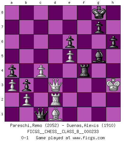 Last move : 0-1 2016 July 14 2:20:41 [Event "FICGS__CHESS__CLASS_B__000233"] [Site "FICGS"] [Date "2015.11.05"] [Round "1"] [White "Pareschi,Remo"] [Black "Duenas,Alexis"] [Result "0-1"] [WhiteElo "2052"] [BlackElo "1910"] 1.e4 c5 2.Nf3 d6 3.Bc4 e6 4.d3 Nf6 5.c3 Be7 6.Bb3 O-O 7.Ng5 Nc6 8.f4 b5 9.Qe2 a5 10.O-O a4 11.Bc2 b4 12.Nf3 Bb7 13.Bd1 d5 14.e5 Ng4 15.h3 Nh6 16.g4 Ba6 17.a3 b3 18.Nbd2 Kh8 19.Ne1 Qd7 20.Ndf3 Ng8 21.Be3 f6 22.Qg2 fxe5 23.fxe5 d4 24.cxd4 Nxd4 25.Rf2 Rac8 26.Qg3 Nh6 27.h4 Kg8 28.Rc1 Nhf5 29.gxf5 Nxf5 30.Qf4 c4 31.dxc4 Nxe3 32.Qxe3 Bc5 33.Qe2 Bb7 34.Kh1 Qd4 35.Rg2 Rxf3 36.Nxf3 Bxf3 37.Qxf3 Qxh4+ 38.Rh2 Qe1+ 39.Kg2 Qd2+ 40.Kh1 Qxc1 41.Qd3 h6 42.Rg2 Rf8 43.Kh2 Rf4 44.Kh3 Be7 45.Rd2 Bg5 0-1 Sicilian Kingside Castling by player Black (move 6) Kingside Castling by player White (move 10) Player Black won this chess game. Follow this game move after move (download)Bobby just drops the pieces and they fall on the right squares. (Miguel Najdorf) Frage: Was machen Sie mit den Preisen? Anwort: Ich habe Angst, dass meine Freundin davon neue Kleider kauft. (Loek van Wely) El muchacho (en ese entonces un niño de 12 años llamado Anatoly Karpov) no tiene ni idea de lo que es el Ajedrez y no hay futuro en absoluto para el en esta profesión. (Mikhail Botvinnik) Les erreurs sont comme les malheurs, elles n'arrivent jamais seules. (Siegbert Tarrasch) Don't be irreplaceable, if you can't be replaced, you can't be promoted. (Dan Rotaru)