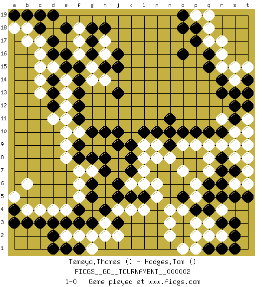 Last move : 1-0 2006 August 14 15:22:57 [Event "FICGS__GO__TOURNAMENT__000002"] [Site "FICGS"] [Date "2006.05.30"] [Round "1"] [Black "Tamayo,Thomas"] [White "Hodges,Tom"] [Result "1-0"] 1.q16 r4 2.d16 d4 3.p4 n3 4.r3 q3 5.q4 p3 6.o3 o4 7.o2 r2 8.s3 p2 9.o5 n4 10.r5 c14 11.s2 n2 12.q10 f17 13.e15 c17 14.d17 c16 15.d13 c13 16.j16 g15 17.g16 f16 18.f15 h16 19.g17 h17 20.g18 f18 21.h18 d18 22.h15 g14 23.d12 h14 24.j15 d15 25.d14 c15 26.e16 e14 27.f14 e13 28.f13 e12 29.f12 e11 30.f11 d11 31.j13 r16 32.q15 r15 33.r14 s14 34.r13 q17 35.p17 r17 36.o16 f10 37.f3 h3 38.c3 c4 39.d3 e4 40.b3 b4 41.s13 e2 42.e3 f2 43.f4 f5 44.h4 j4 45.g3 g2 46.j3 h2 47.j5 k4 48.g5 f6 49.k5 l4 50.g10 g9 51.h10 h9 52.j10 m6 53.g6 f7 54.j9 o7 55.n9 m8 56.l10 q7 57.s7 p9 58.p10 o9 59.o10 n8 60.f9 e10 61.g8 e9 62.h8 r9 63.r7 q8 64.f8 e8 65.a4 a5 66.a3 b6 67.e18 p5 68.q5 p6 69.c18 b18 70.d19 q18 71.p18 r11 72.r10 s10 73.s9 s8 74.s11 t9 75.s12 s15 76.d2 p19 77.o19 q19 78.o18 s6 79.r6 t7 80.s5 t6 81.t5 t8 82.r1 q2 83.b19 b17 84.k7 m9 85.m10 n10 86.n11 l7 87.q1 o1 88.r8 q9 89.l5 m5 90.k8 g7 91.h7 l6 92.e1 j2 93.t14 k6 94.j6 t15 95.t13 l9 96.k9 t11 97.f1 g1 98.d1 a18 99.t12 s9 100.n9 t10 101.n10 p1 102.s1 pass 103.c19 pass 104.a19 l8 105.q6 1-0 Comment by player 1 : Thomas Tamayo : All further moves are miai. I count B+ with the following method (please check my numbers): live stones: B: , W: opponents captured on board: B: 10, W: 5 spaces captured on board: B: 89, W: 73 komi: B: 0, W: 7.5 total: B: , W: Result: B+ Here are the names of the openings (joseki) played in the four corners : Corner q4 : r4 p4 Komoku (Somok, Xiao~mu`) 3-4 Point. The komoku (3-4) point is the traditional corner enclosure move.. Ikken Takagakari (Hankan Nop'dakeolch'im, Yi Gaogua`jiao~, 1-Space High Approach). The 5-4 approach move has become more popular in modern times, as modern Go emphasizes speed and influence. Corner d16 : d16 c14 Hoshi (Hwajeom, Seongjeom, Xingwei`) 4-4 Point. The star or hoshi (4-4) point, emphasizing influence at the potential expense of territory. Ikken Kakari (Hankan Keolch'im, Yi Gua`jiao~, 1-Space Low Approach). White 2 is the standard approach move to the 4-4. Corner q16 : q16 r16 Hoshi (Hwajeom, Seongjeom, Xingwei`) 4-4 Point. The star or hoshi (4-4) point, emphasizing influence at the potential expense of territory. Corner d4 : d4 f3 Hoshi (Hwajeom, Seongjeom, Xingwei`) 4-4 Point. The star or hoshi (4-4) point, emphasizing influence at the potential expense of territory. Ikken Kakari (Hankan Keolch'im, Yi Gua`jiao~, 1-Space Low Approach). Black 2 is the standard approach move to the 4-4. Player Black won this Go (weiqi, baduk) game. Follow this game move after move (download)The poor player plays the opponent's game for him. (Anonymous) The best weapon against an enemy is another enemy. (Friedrich Nietzsche)