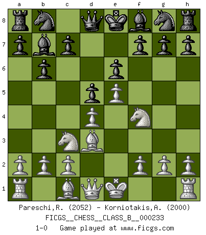 Last move : 1-0 2015 December 20 9:23:31 [Event "FICGS__CHESS__CLASS_B__000233"] [Site "FICGS"] [Date "2015.11.05"] [Round "1"] [White "Pareschi,Remo"] [Black "Korniotakis,Antonis"] [Result "1-0"] [WhiteElo "2052"] [BlackElo "2000"] 1.e4 b6 2.d4 e6 3.Nc3 Bb7 4.Bd3 Nf6 5.Nge2 d5 6.e5 Ng8 7.Nf4 1-0 This chess game has been lost on time (started : 2015.11.05 12:43:52) Owen defense Player White won this chess game. Follow this game move after move (download)One bad move nullifies forty good ones. (Horowitz) Es genügt nicht ein guter Spieler zu sein, man muß auch gut spielen. (Siegbert Tarrasch) La mitad de las variaciones que son calculadas en una partida de torneo, resultan ser completamente superfluas. Desafortunadamente, nadie sabe por adelantado cual mitad. (Jan Tinman) J'ai toujours senti une vague pitié pour l'homme qui ne connaît rien aux échecs, tout comme j'en aurais pour un homme ignorant de l'amour. Les Echecs, comme la musique ou comme l'amour, ont le pouvoir de rendre heureux. (Siegbert Tarrasch) There are lots of people who mistake their imagination for their memory. (Josh Bilings)