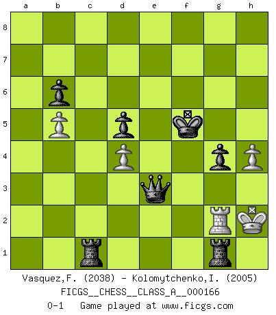 Last move : 0-1 2017 February 4 19:51:26 [Event "FICGS__CHESS__CLASS_A__000166"] [Site "FICGS"] [Date "2015.11.05"] [Round "1"] [White "Vasquez,Fernando"] [Black "Kolomytchenko,Igor"] [Result "0-1"] [WhiteElo "2038"] [BlackElo "2005"] 1.e4 c6 2.d4 d5 3.e5 Bf5 4.Nf3 e6 5.Be2 h6 6.O-O Ne7 7.Nc3 Nd7 8.a3 g5 9.Be3 Bg7 10.b4 O-O 11.Qd2 b6 12.Rad1 a5 13.h4 g4 14.Ne1 h5 15.Bg5 f6 16.exf6 Nxf6 17.Nd3 axb4 18.axb4 Ng6 19.Ne5 Qe8 20.Nxg6 Qxg6 21.Bd3 Bxd3 22.cxd3 Nh7 23.Be3 g3 24.Ne2 gxf2+ 25.Bxf2 Ra3 26.Qc2 Bh6 27.Rde1 Ra7 28.Qxc6 Bd2 29.Rd1 Rg7 30.g3 Bh6 31.Kh1 Rgf7 32.Kg2 Nf6 33.b5 Ne4 34.dxe4 Qxe4+ 35.Kg1 Be3 36.Nc3 Bxf2+ 37.Rxf2 Qe3 38.Qxe6 Qxe6 39.Re2 Qh3 40.Rg2 Qg4 41.Ne2 Ra7 42.Rd2 Ra1+ 43.Kh2 R8f1 44.Ng1 Qf3 45.Rb2 Qe3 46.Rbc2 Rxg1 47.Rc8+ Kg7 48.Rc7+ Kg6 49.Rc6+ Kf5 50.Rc1 Raxc1 51.g4+ hxg4 0-1 Caro-Kann : Advance variation Kingside Castling by player White (move 6) Kingside Castling by player Black (move 10) Player Black won this chess game. Follow this game move after move (download)When your house is on fire, you can't be bothered with the neighbors. Or, as we say in Chess, if your King is under attack you don't worry about losing a Pawn on the Queen's side. (Gary Kasparov) Je mehr ich von der FIDE weiss, um so weniger verstehe ich. (Alexander Kalifman) Juega la Apertura como un libro, el Juego Medio como un mago y los Finales como una máquina. (Spielmann) À la honte des hommes, on sait que les lois du jeu sont les seules qui soient partout justes, claires, inviolables et exécutées. Pourquoi l'Indien qui a donné les règles du jeu d'échecs est-il obéi de bon gré dans toute la terre, et que les décrétales des papes, par exemple, sont aujourd'hui un objet d'horreur et de mépris ? C'est que l'inventeur des échecs combina tout avec justesse pour la satisfaction des joueurs, et que les papes, dans leurs décrétales, n'eurent en vue que leur seul avantage. L'Indien voulut exercer également l'esprit des hommes et leur donner du plaisir; les papes ont voulu abrutir l'esprit des hommes. Voltaire (Dictionnaire philosophique / Garnier 1967) In theory there is no difference between theory and practice. In practice there is. (Yogi Berra)