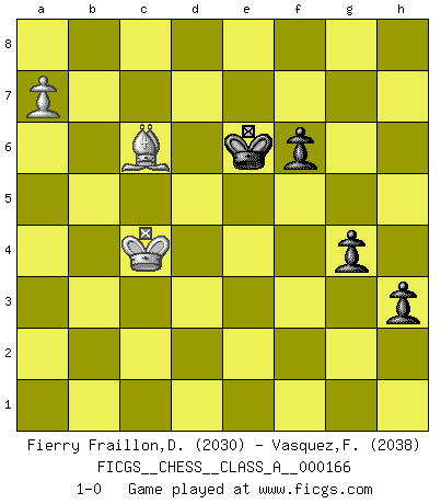 Last move : 1-0 2017 February 19 20:54:31 [Event "FICGS__CHESS__CLASS_A__000166"] [Site "FICGS"] [Date "2015.11.05"] [Round "1"] [White "Fierry Fraillon,David"] [Black "Vasquez,Fernando"] [Result "1-0"] [WhiteElo "2030"] [BlackElo "2038"] 1.c4 e5 2.Nc3 Nf6 3.Nf3 Nc6 4.g3 Bc5 5.Bg2 d6 6.O-O O-O 7.d3 h6 8.a3 Nd4 9.Ne1 a5 10.e3 Ne6 11.Nf3 Re8 12.b3 c6 13.Bb2 Bb6 14.Qc2 Bd7 15.Rfd1 Ng5 16.Nxg5 hxg5 17.Na4 Bg4 18.Rd2 Bc7 19.d4 Qe7 20.h3 Bh5 21.Nc3 Bg6 22.Qd1 e4 23.d5 Nd7 24.g4 Rab8 25.Ne2 Nc5 26.Bc3 a4 27.bxa4 Ra8 28.Rb1 Rec8 29.Bd4 Ba5 30.Rdb2 b6 31.Ng3 Nd3 32.Rb3 Nc5 33.Bxc5 dxc5 34.dxc6 Rd8 35.Qf1 Rac8 36.Rd1 Rxd1 37.Qxd1 Rxc6 38.Nf5 Bxf5 39.gxf5 Rd6 40.Qg4 Rd3 41.Rb1 Rc3 42.Rd1 Rxc4 43.Qg3 Kh7 44.Qb8 Qf6 45.Qc8 Rc2 46.Bxe4 Rd2 47.Rxd2 Bxd2 48.Qd7 Qe5 49.Qb7 Bxe3 50.fxe3 Qg3+ 51.Kf1 Qxe3 52.Qd5 Qxh3+ 53.Ke2 Qh2+ 54.Kd1 f6 55.Qd2 Qe5 56.Qe3 g4 57.Kc2 Qh2+ 58.Kb3 Qh3 59.Qxh3+ gxh3 60.a5 bxa5 61.Ka4 Kh6 62.Kxa5 Kg5 63.Kb5 Kf4 64.Bc6 Kxf5 65.a4 g5 66.a5 g4 67.a6 c4 68.Kxc4 Ke6 69.a7 1-0 English Opening Kingside Castling by player White (move 6) Kingside Castling by player Black (move 6) 10 pieces endgame at move 60 : White KBPP , Black KPPPPP WHITE : King + 1 Bishop 2 Pawns BLACK : King + 5 Pawns 9 pieces endgame at move 62 : White KBPP , Black KPPPP WHITE : King + 1 Bishop 2 Pawns BLACK : King + 4 Pawns 8 pieces endgame at move 64 : White KBP , Black KPPPP WHITE : King + 1 Bishop 1 Pawn BLACK : King + 4 Pawns 7 pieces endgame at move 68 : White KBP , Black KPPP WHITE : King + 1 Bishop 1 Pawn BLACK : King + 3 Pawns Player White won this chess game. Follow this game move after move (download)Bobby Fischer is the greatest Chess genius of all time ! (Alexander Kotov) Moralische Siege zählen nicht. (Savielly Grigorievitsch Tartakower) ¿Cual es el objetivo de jugar una apertura de gambito?... Para adquirir una reputación de ser un jugador apuesto a costo de perder el juego. (Siegbert Tarrasch) Les Echecs, c'est l'art de la guerre sans les charniers, c'est la résurrection des morts tombés au champ d'honneur, l'espoir perpétuel, la suprématie de l'intelligence sur la force, la culture de l'esprit. (F. Szpiner) Rules and bones are meant to be broken. (Anonymous)