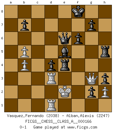 Last move : 0-1 2016 June 16 6:21:47 [Event "FICGS__CHESS__CLASS_A__000166"] [Site "FICGS"] [Date "2015.11.05"] [Round "1"] [White "Vasquez,Fernando"] [Black "Alban,Alexis"] [Result "0-1"] [WhiteElo "2038"] [BlackElo "2247"] 1.e4 c5 2.c3 Nf6 3.e5 Nd5 4.d4 cxd4 5.cxd4 d6 6.Nf3 Nc6 7.Bf4 Nxf4 8.d5 Qa5+ 9.Nc3 Nxe5 10.Nxe5 dxe5 11.Qf3 h5 12.Bb5+ Kd8 13.O-O f6 14.Rfc1 Bg4 15.Qe4 Rc8 16.Bf1 h4 17.a4 Rh5 18.d6 exd6 19.b4 Qc7 20.Nd5 Bf5 21.Qe1 Qf7 22.Nxf4 exf4 23.Qd2 f3 24.Qe3 d5 25.Qxa7 Bd6 26.Qb6+ Bc7 27.Qe3 fxg2 28.Be2 Rh8 29.Bd3 Bd7 30.Bb5 h3 31.Rd1 Bxb5 32.axb5 Be5 33.Ra3 Qe6 34.f4 Rh5 35.Rad3 Ke8 36.Re1 Kf8 37.Red1 Rc4 38.Kf2 Rxf4+ 39.Ke2 d4 40.Qg3 Re4+ 0-1 Sicilian : Alapin's variation (2.c3) Kingside Castling by player White (move 13) Player Black won this chess game. Follow this game move after move (download)Do you realize Fischer almost never has any bad pieces? He exchanges them, and the bad pieces remain with his opponents. (Yuri Balashov) Ich war zu klein für die Schach-Schülermannschaft! (Woody Allen) No hay un Gran Maestro de Ajedrez que sea normal; solo se diferencían ellos por la magnitud de su locura. (Viktor Korchnoi) Votre prénom est 'Tactique', votre deuxième prénom est 'Tactique' et votre nom est 'Tactique'. (Ken Smith) Creativity is allowing yourself to make mistakes. Art is knowing which ones to keep. (Scott Adams)