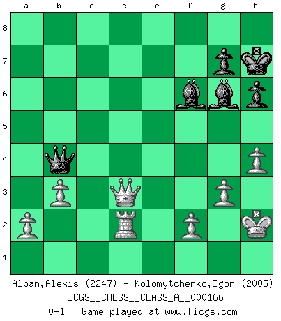 Last move : 0-1 2016 November 27 18:45:41 [Event "FICGS__CHESS__CLASS_A__000166"] [Site "FICGS"] [Date "2015.11.05"] [Round "1"] [White "Alban,Alexis"] [Black "Kolomytchenko,Igor"] [Result "0-1"] [WhiteElo "2247"] [BlackElo "2005"] 1.d4 d5 2.Nf3 Nf6 3.c4 c6 4.e3 e6 5.Nbd2 Nbd7 6.Bd3 b6 7.b3 Bd6 8.O-O O-O 9.Bb2 Qc7 10.Re1 Bb7 11.Qc2 h6 12.Rad1 Rad8 13.h3 a5 14.e4 dxe4 15.Nxe4 Nxe4 16.Bxe4 Bb4 17.Re3 Nf6 18.Bd3 Be7 19.Qe2 Nh5 20.g3 Nf6 21.Rxe6 fxe6 22.Qxe6+ Rf7 23.Bg6 Rdf8 24.Ne5 Bd8 25.Nxf7 Rxf7 26.d5 cxd5 27.Bxf6 Bxf6 28.cxd5 Qe7 29.Bxf7+ Qxf7 30.Qxb6 Bxd5 31.Qxa5 Bf3 32.Rd3 Be4 33.Re3 Qb7 34.Qe1 Bc6 35.Qd1 Bg5 36.Rc3 Bf6 37.Rc1 Bg5 38.Rc4 Bh1 39.Qf1 Bd5 40.Rc2 Bf6 41.Kh2 Kh7 42.h4 Bf7 43.Rd2 Qb4 44.Qd3+ Bg6 0-1 Queen's pawn game Kingside Castling by player White (move 8) Kingside Castling by player Black (move 8) Player Black won this chess game. Follow this game move after move (download)When asked, -How is that you pick better moves than your opponents?, I responded: I'm very glad you asked me that, because, as it happens, there is a very simple answer. I think up my own moves, and I make my opponent think up his. (Alexander Alekhine) Der Umstand, daß uns eine 7 Stunden Zeitkontrolle ermöglicht eine großartige, tiefe Partie zu spielen, ist für die Massenmedien nicht weiter von Bedeutung. (Alexej Shirov) Al jugar al Ajedrez entonces, podemos aprender: Primero: Previsión... Segundo: Prudencia... Tercero: Cautela... Y al final, aprendemos del Ajedrez el hábito de no ser desanimados por apariencias malas presentes en el estado de nuestros asuntos, el hábito de la esperanza por una oportunidad favorable y la perseveración de los secretos de los recursos. (Benjamin Franklin) Vous n'êtes pas toujours obligé de jouer le meilleur coup. Un coup doit être actif, entreprenant, correct et beau ! (David Bronstein) If you lose the game you should win the analysis! (Proverb)
