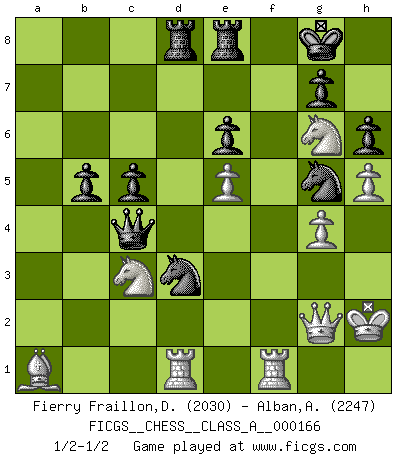 Last move : 1/2-1/2 2016 March 29 6:35:31 [Event "FICGS__CHESS__CLASS_A__000166"] [Site "FICGS"] [Date "2015.11.05"] [Round "1"] [White "Fierry Fraillon,David"] [Black "Alban,Alexis"] [Result "1/2-1/2"] [WhiteElo "2030"] [BlackElo "2247"] 1.c4 Nf6 2.Nf3 b6 3.g3 Bb7 4.Bg2 e6 5.O-O Be7 6.b3 O-O 7.Bb2 d5 8.e3 c5 9.Nc3 dxc4 10.bxc4 Nc6 11.Qe2 Qc7 12.d3 a6 13.Rab1 Rab8 14.Ba1 Rfd8 15.Rfd1 Na5 16.Ne1 Bxg2 17.Nxg2 Nc6 18.Ne1 Na7 19.a4 Nc6 20.f4 Nb4 21.Nf3 Qc6 22.Ne5 Qb7 23.Rd2 Nd7 24.Nf3 Rbc8 25.Rbd1 Nf6 26.h3 Ne8 27.g4 Nd6 28.h4 Rf8 29.Qg2 f6 30.h5 Rcd8 31.Bb2 Qc6 32.Qg3 Qc8 33.e4 h6 34.Nh4 Nf7 35.Ng6 Rfe8 36.Rf2 Qd7 37.e5 fxe5 38.fxe5 Nxd3 39.Ba1 Bh4 40.Qxh4 Ng5 41.R2f1 Qd4+ 42.Kh2 Qxc4 43.Qg3 b5 44.axb5 axb5 45.Qg2 Ra8 46.Rf3 Rad8 47.R3f1 Ra8 48.Rf3 Rad8 49.R3f1 1/2-1/2 English Opening Kingside Castling by player White (move 5) Kingside Castling by player Black (move 6) This chess game ended in a draw. Follow this game move after move (download)In the perfect Chess combination as in a first-rate short story, the whole plot and counter-plot should lead up to a striking finale, the interest not being allayed until the very last moment. (Yates and Winter) Garry Kasparov war erst in der Großmeister-Organisation GMA, dann in der Profischach-Vereinigung PCA, zum Schluss kehrte er wieder in den Schoß der FIDE zurück. Aber gut, manche Leute sind flexibel (Viswanathan Anand) Las ideas audaces son como las piezas del Ajedrez que avanzan hacia adelante. Ellas pueden ser vencidas, pero también pueden iniciar una partida victoriosa. (Goethe) Il a essayé de se convaincre qu'il pourrait empêcher toutes les erreurs et ne jamais perdre. L'horreur ! Gary Kasparov au sujet de Robert Fischer. Wisdom is the reward you get for a lifetime of listening when you'd have preferred to talk. (Doug Larson)