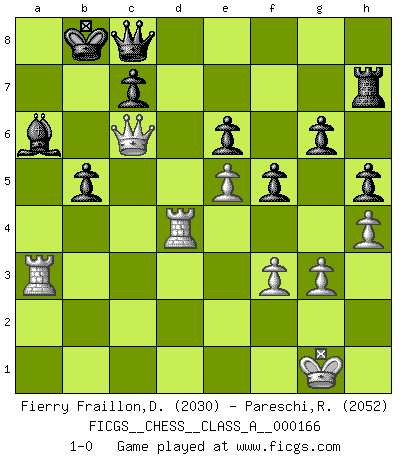 Last move : 1-0 2016 July 14 9:28:15 [Event "FICGS__CHESS__CLASS_A__000166"] [Site "FICGS"] [Date "2015.11.05"] [Round "1"] [White "Fierry Fraillon,David"] [Black "Pareschi,Remo"] [Result "1-0"] [WhiteElo "2030"] [BlackElo "2052"] 1.c4 Nf6 2.Nf3 e6 3.g3 b6 4.Bg2 Bb7 5.O-O Be7 6.Nc3 d6 7.d4 d5 8.cxd5 Nxd5 9.Qa4+ Qd7 10.Qc2 Nc6 11.e4 Nxc3 12.Qxc3 O-O-O 13.Rd1 Kb8 14.Be3 h5 15.h4 Bd6 16.Bh3 f5 17.a3 g6 18.Bg5 Rde8 19.Ne5 Bxe5 20.dxe5 Qc8 21.Bf1 Ne7 22.a4 a5 23.Bb5 Bxe4 24.Bxe8 Rxe8 25.Bxe7 Rxe7 26.b4 axb4 27.Qxb4 Qe8 28.a5 b5 29.Rac1 Ka8 30.Qc5 Rf7 31.Rd4 Rh7 32.Rc3 Qc8 33.f3 Bb7 34.a6 Bxa6 35.Ra3 Kb8 36.Qc6 1-0 English Opening Kingside Castling by player White (move 5) Queenside Castling by player Black (move 12) Player White won this chess game. Follow this game move after move (download)I am the best player in the world and I am here to prove it. (Bobby Fischer) Ich könnte leicht behaupten: Ja,ja, Leonid Breschnew wollte nicht, daß ich Weltmeister werde. In der Tat war die Sache komplizierter. (Viktor Kortschnoi) Diferente gente reacciona diferentemente en aceptar la derrota. (Bobby Fischer) La vie et les Echecs sont tous les deux une lutte constante. (Lasker) Good luck. You're gonna need it. (Han Solo in Star Wars ep.6)