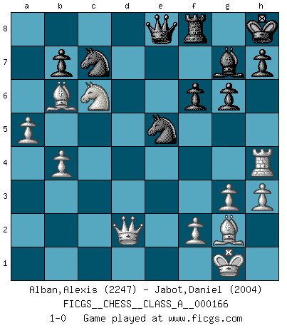 Last move : 1-0 2016 June 22 21:43:34 [Event "FICGS__CHESS__CLASS_A__000166"] [Site "FICGS"] [Date "2015.11.05"] [Round "1"] [White "Alban,Alexis"] [Black "Jabot,Daniel"] [Result "1-0"] [WhiteElo "2247"] [BlackElo "2004"] 1.d4 Nf6 2.c4 g6 3.g3 Bg7 4.Bg2 d5 5.cxd5 Nxd5 6.Nf3 Nb6 7.Nc3 Nc6 8.O-O O-O 9.d5 Na5 10.Qc2 c6 11.dxc6 Nxc6 12.Rd1 Bf5 13.e4 Bd7 14.a4 Rc8 15.Qe2 Na8 16.Be3 Qe8 17.a5 Nc7 18.h3 Rb8 19.Nd5 Na6 20.e5 Rc8 21.Rac1 Kh8 22.Rc4 Rd8 23.Rh4 f6 24.b4 Be6 25.Nf4 Bc8 26.Rxd8 Nxd8 27.Nd5 Be6 28.Qd3 Bf5 29.Qd2 Bd7 30.Bxa7 Bc6 31.Bb6 Nf7 32.exf6 exf6 33.Nd4 Ne5 34.Nc7 Nxc7 35.Nxc6 1-0 King's Indian : 3.g3, counterthrust variation Kingside Castling by player White (move 8) Kingside Castling by player Black (move 8) Player White won this chess game. Follow this game move after move (download)Bobby Fischer is the greatest Chess player who has ever lived. (Ken Smith) Im Internet Chess Club betrug mein Rating vorübergehend 3350 ELO-Punkte. (Sergej Karjakin) El Peón aislado arroja penumbra sobre todo el tablero. (Aaron Nimzovich) Lorsque vous vous retrouvez devant une position atroce, ne tendez pas un ultime piège dérisoire avec l'intention d'abandonner si l'adversaire le déjoue ! Faites-vous plutôt un devoir de résister comme si votre vie en dépendait. Jouez le coup qui vous déplairait au centuple si vous étiez dans la peau de votre tortionnaire ! Have no fear of perfection - you'll never reach it. (Salvador Dali)