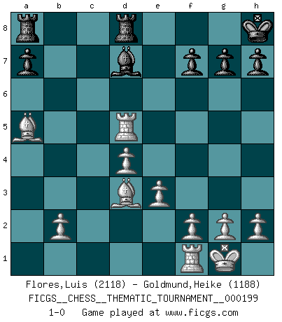 Last move : 1-0 2015 November 27 10:42:23 [Event "FICGS__CHESS__THEMATIC_TOURNAMENT__000199"] [Site "FICGS"] [Date "2015.11.08"] [Round "1"] [White "Flores,Luis"] [Black "Goldmund,Heike"] [Result "1-0"] [WhiteElo "2118"] [BlackElo "1188"] 1.d4 d5 2.c4 e6 3.Nc3 c6 4.Nf3 dxc4 5.a4 Bb4 6.e3 Nf6 7.Bxc4 O-O 8.O-O Nbd7 9.Qc2 Qc7 10.Bd2 Nb6 11.Bd3 Nbd5 12.Nxd5 exd5 13.Bxb4 Re8 14.a5 Bg4 15.Ne5 b6 16.Qxc6 Qxc6 17.Nxc6 bxa5 18.Rxa5 Bd7 19.Ne7+ Kh8 20.Nxd5 Nxd5 21.Rxd5 Red8 22.Ba5 1-0 QGD : Semi-Slav, Noteboom variation Kingside Castling by player Black (move 7) Kingside Castling by player White (move 8) Player White won this chess game. Follow this game move after move (download)The only thing Chess players have in common is Chess. (Lodewijk Prins) Garry Kasparov war erst in der Großmeister-Organisation GMA, dann in der Profischach-Vereinigung PCA, zum Schluss kehrte er wieder in den Schoß der FIDE zurück. Aber gut, manche Leute sind flexibel (Viswanathan Anand) El Ajedrez es un terrible juego. Si no controlas el centro, tu oponente tiene una posición mas holgada. Si tienes control del centro, ¡entonces realmente tu tienes algo de que preocuparte!. (Siegbert Tarrasch) Je ne suis pas le dernier à jouer lâchement des coups douteux pendant le zeïtnot de l'adversaire pour l'achever: en effet les coups qui font le plus peur sont ceux que l'on ne comprend pas. Je me fais souvent peur quand je joue. (Un professeur anonyme) Wisdom doesn't necessarily come with age. Sometimes age just shows up all by itself. (Tom Watson)