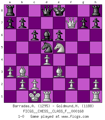 Last move : 1-0 2015 November 13 23:34:34 [Event "FICGS__CHESS__CLASS_F__000168"] [Site "FICGS"] [Date "2015.11.11"] [Round "1"] [White "Barradas,Anderson"] [Black "Goldmund,Heike"] [Result "1-0"] [WhiteElo "1295"] [BlackElo "1188"] 1.e4 d5 2.exd5 Qxd5 3.Nc3 Qa5 4.Nf3 Nf6 5.d4 Bf5 6.Ne5 c6 7.a3 Qc7 8.Bf4 Qd8 9.Bc4 e6 10.g4 Bxg4 11.Nxg4 Nh5 12.Be3 Nd7 13.Qf3 Nhf6 14.O-O-O Nb6 15.Bb3 Nbd5 16.Nxd5 Nxd5 17.Ne5 Bd6 18.Qxf7+ 1-0 Scandinavian (centre counter) defense Queenside Castling by player White (move 14) Player White won this chess game. Follow this game move after move (download)I have added these principles to the law: get the Knights into action before both Bishops are developed. (Emanuel Lasker) Man braucht nicht immer den besten Zug zu spielen: Ein Zug muß aktiv, unternehmungslustig, korrekt und schön sein. (David Bronstein) El jugador de combinación piensa hacia adelante; comienza de la posición dada y trabaja las movidas contundentes en su mente. (Emanuel Lasker) Comme les marins qui ont mille raisons différentes d'aller en mer, les joueurs d'échecs en ont tout autant avant de s'installer devant une table et jouer... (Vincent Bertignac, philosophe) Don't be discouraged. It's often the last key in the bunch that opens the lock. (Author unknown)