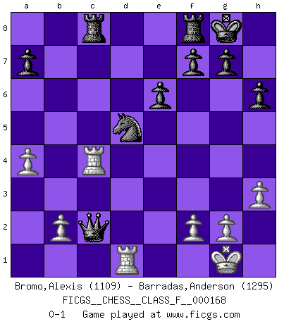 Last move : 0-1 2015 November 20 22:48:46 [Event "FICGS__CHESS__CLASS_F__000168"] [Site "FICGS"] [Date "2015.11.11"] [Round "1"] [White "Bromo,Alexis"] [Black "Barradas,Anderson"] [Result "0-1"] [WhiteElo "1109"] [BlackElo "1295"] 1.d4 Nf6 2.c4 e6 3.a3 b6 4.Nc3 d5 5.Nf3 c5 6.e3 Be7 7.h3 Ba6 8.Bd3 h6 9.O-O O-O 10.Bd2 dxc4 11.Bc2 Nc6 12.Re1 cxd4 13.exd4 Nxd4 14.Nxd4 Qxd4 15.Qe2 Bc5 16.Be3 Qd6 17.Bxc5 Qxc5 18.Rad1 Qg5 19.Ba4 b5 20.Bxb5 Bxb5 21.Nxb5 Qxb5 22.Qc2 Rac8 23.Re3 Nd5 24.Re4 Nf6 25.Red4 Nd5 26.a4 Qb3 27.Rxc4 Qxc2 0-1 Queen's pawn game Kingside Castling by player White (move 9) Kingside Castling by player Black (move 9) Player Black won this chess game. Follow this game move after move (download)He who takes the Queen's Knight's Pawn will sleep in the streets. (Anonymous) Deine Wertungszahl - vorausgesetzt einige Jahre schachliche Anstrengung - entspricht etwa dem zehnfachen Deines IQ plus 1000. (Jonathan Levitt) La pasion por jugar al Ajedrez es una de las mas inexplicables en el mundo. (H.G. Wells) Des combinaisons [dans le jeu d'échecs] pareilles à des mélodies. Je crois entendre pour ainsi dire la musique des coups... (Vladimir Nabokov) It's not enough to succeed. Others must fail. (Gore Vidal)