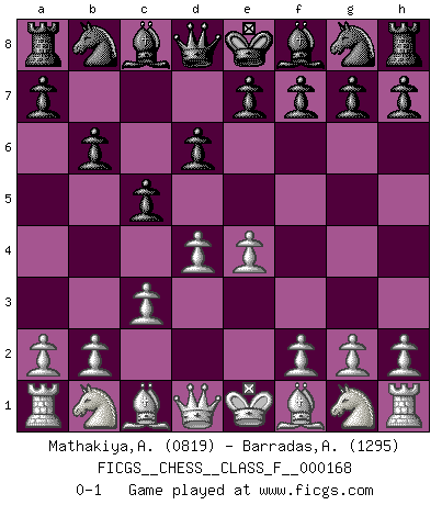 Last move : 0-1 2016 January 1 10:27:0 [Event "FICGS__CHESS__CLASS_F__000168"] [Site "FICGS"] [Date "2015.11.11"] [Round "1"] [White "Mathakiya,Azaz"] [Black "Barradas,Anderson"] [Result "0-1"] [WhiteElo "0819"] [BlackElo "1295"] 1.e4 c5 2.c3 d6 3.d4 b6 0-1 This chess game has been lost on time (started : 2015.11.11 18:19:37) Sicilian : Alapin's variation (2.c3) Player Black won this chess game. Follow this game move after move (download)I like the moment when I break a man's ego. (Bobby Fischer) Wenn Du nicht kämpfst, um anderen etwas zu beweisen, sondern nur für Dich selbst, dann bist du fast unbesiegbar. (Garry Kasparov) El pensamiento metódico es mas útil en el Ajedrez que la inspiración. (C. J. S. Purdy) Tous ces prétendus hommes politiques sont les pions, les Cavaliers, les Tours ou les Fous d'une partie d'échecs qui se jouera tant qu'un hasard ne renversera pas l'échiquier. (Honoré de Balzac) To be champion requires more than simply being a strong player; one has to be a strong human being as well. (Anatoly Karpov)