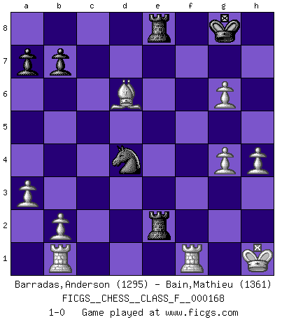Last move : 1-0 2016 March 16 6:32:0 [Event "FICGS__CHESS__CLASS_F__000168"] [Site "FICGS"] [Date "2015.11.11"] [Round "1"] [White "Barradas,Anderson"] [Black "Bain,Mathieu"] [Result "1-0"] [WhiteElo "1295"] [BlackElo "1361"] 1.e4 Nf6 2.Nc3 d5 3.exd5 e6 4.dxe6 Qe7 5.Bc4 Bxe6 6.Bxe6 Qxe6+ 7.Qe2 Qxe2+ 8.Ngxe2 Nc6 9.d3 Bb4 10.a3 Bxc3+ 11.Nxc3 Nd4 12.O-O O-O 13.Ne4 Nxe4 14.dxe4 Nxc2 15.Rb1 Rfe8 16.f3 f5 17.exf5 Rf8 18.g4 Rae8 19.Bf4 Nd4 20.Bxc7 Re3 21.Kg2 h5 22.h4 hxg4 23.fxg4 g6 24.Bd6 Rfe8 25.fxg6 Re2+ 26.Kh1 1-0 This chess game has been lost on time (started : 2015.11.11 18:19:37) Alekhine's defense : Scandinavian variation Kingside Castling by player White (move 12) Kingside Castling by player Black (move 12) Player White won this chess game. Follow this game move after move (download)What is the difference between chess and football? Everybody understands football, but nobody plays it. Everybody plays chess, but nobody understands it. Everything is relative. (Vladimir Kramnik) Der Freibauer hat für mich eine Seele, genau wie der Mensch, Wünsche, die unerkannt in ihm schlummern, und Befürchtungen, von deren Existenz er selbst kaum ahnt. (Aaron Nimzowitsch) La vida es como un juego de Ajedrez, cambiando con cada movimiento. (Proverbio Chino) Aidez vos pièces, elles vous aideront. (Paul Morphy) You must have a dream in order to have it come true. (A.P.J. Kalam)