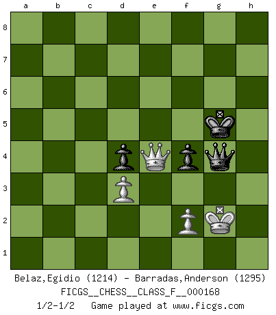 Last move : 1/2-1/2 2016 January 1 14:9:59 [Event "FICGS__CHESS__CLASS_F__000168"] [Site "FICGS"] [Date "2015.11.11"] [Round "1"] [White "Belaz,Egidio"] [Black "Barradas,Anderson"] [Result "1/2-1/2"] [WhiteElo "1214"] [BlackElo "1295"] 1.e4 e5 2.Bc4 Nf6 3.Nc3 c6 4.Nf3 d6 5.O-O b5 6.Bb3 a5 7.Ng5 d5 8.exd5 Nxd5 9.d3 a4 10.Bxd5 cxd5 11.Nxb5 Be7 12.Nf3 Nc6 13.a3 O-O 14.Nc3 d4 15.Ne4 Bg4 16.h3 Bh5 17.Ng3 Bxf3 18.gxf3 g6 19.Bh6 Re8 20.Ne4 f5 21.Nd2 Bg5 22.Bxg5 Qxg5+ 23.Kh2 Rab8 24.Rg1 Qf4+ 25.Kh1 Rxb2 26.Nc4 Rb5 27.Nd6 R5b8 28.Nxe8 Rxe8 29.Rg3 Kf7 30.Rb1 Re7 31.Kg2 h5 32.Rb6 h4 33.Rxg6 Kxg6 34.Rxc6+ Kh5 35.c3 Rg7+ 36.Kf1 Kg5 37.Ke2 Kh5 38.cxd4 exd4 39.Qd2 Qe5+ 40.Kf1 f4 41.Rc4 Rb7 42.Rb4 Rg7 43.Rxa4 Kh6 44.Ra5 Qb8 45.Qe1 Qb6 46.Qb4 Qc7 47.Rc5 Qd7 48.Qb6+ Rg6 49.Qc7 Qxh3+ 50.Ke2 Re6+ 51.Re5 Qf5 52.Rxe6+ Qxe6+ 53.Kf1 Qh3+ 54.Kg1 Qxf3 55.Qd6+ Kg5 56.Qe7+ Kg6 57.Qxh4 Kf5 58.Qh7+ Kg4 59.Qg6+ Kh4 60.a4 Qd1+ 61.Kh2 Qxa4 62.Qe4 Kg5 63.Kh3 Qd7+ 64.Kg2 Qg4+ 65.Kf1 Qd1+ 66.Kg2 Qg4+ 67.Kf1 Qd1+ 68.Kg2 Qg4+ 1/2-1/2 Bishop's Opening : Berlin defense Kingside Castling by player White (move 5) Kingside Castling by player Black (move 13) 10 pieces endgame at move 54 : White KQPPP , Black KQPPP WHITE : King + 1 Queen 3 Pawns BLACK : King + 1 Queen 3 Pawns 9 pieces endgame at move 57 : White KQPPP , Black KQPP WHITE : King + 1 Queen 3 Pawns BLACK : King + 1 Queen 2 Pawns 8 pieces endgame at move 61 : White KQPP , Black KQPP WHITE : King + 1 Queen 2 Pawns BLACK : King + 1 Queen 2 Pawns This chess game ended in a draw. Follow this game move after move (download)The King is a fighting piece. Use it ! (Wilhelm Steinitz) Matt entspricht nicht immer den Tatsachen. (Savielly Grigorievitsch Tartakower) Una clavada es mas poderosa que una espada. (Fred Reinfeld) Vous n'êtes pas toujours obligé de jouer le meilleur coup. Un coup doit être actif, entreprenant, correct et beau ! (David Bronstein) Secret operations are essential in war; upon them the army relies to make its every move. (Sun Tzu)