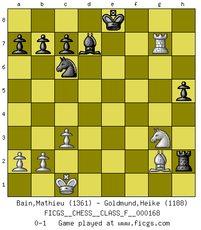 Last move : 0-1 2016 April 15 21:36:19 [Event "FICGS__CHESS__CLASS_F__000168"] [Site "FICGS"] [Date "2015.11.11"] [Round "1"] [White "Bain,Mathieu"] [Black "Goldmund,Heike"] [Result "0-1"] [WhiteElo "1361"] [BlackElo "1188"] 1.d4 d5 2.Nc3 Nf6 3.Bg5 e6 4.e4 Be7 5.e5 Ne4 6.Nxe4 dxe4 7.Bxe7 Qxe7 8.Qg4 O-O 9.h4 Nc6 10.O-O-O h6 11.Ne2 f5 12.exf6 Qxf6 13.c3 Qxf2 14.Ng3 Rf4 15.Rd2 Qe3 16.Qh3 Rf2 17.Ne2 Qxh3 18.gxh3 Bd7 19.Ng3 Rf3 20.Nxe4 Raf8 21.Bg2 R3f5 22.Ng3 Rf4 23.Rf1 Rxh4 24.Rxf8+ Kxf8 25.d5 exd5 26.Bxd5 Rxh3 27.Rf2+ Ke7 28.Rf7+ Ke8 29.Rxg7 h5 30.Bg2 Rh2 0-1 Richter-Veresov attack Kingside Castling by player Black (move 8) Queenside Castling by player White (move 10) Player Black won this chess game. Follow this game move after move (download)Fischer is an American Chess tragedy on par with Morphy and Pillsbury. (Mig Greengard) Du musst nicht gut spielen, es reicht, wenn du besser spielst als dein Gegner. (Anonymous) Uno no tiene que jugar muy bien, es suficiente jugar mejor que el oponente. (Siegbert Tarrasch) Les Echecs sont affaire de jugement sensible. Savoir quand frapper et quand esquiver. (Fischer) Tree pose grows confidence. It roots me to this world. (Terri Guillemets)