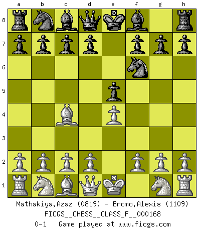 Last move : 0-1 2016 January 2 22:29:20 [Event "FICGS__CHESS__CLASS_F__000168"] [Site "FICGS"] [Date "2015.11.11"] [Round "1"] [White "Mathakiya,Azaz"] [Black "Bromo,Alexis"] [Result "0-1"] [WhiteElo "0819"] [BlackElo "1109"] 1.e4 e5 2.Bc4 Nf6 0-1 This chess game has been lost on time (started : 2015.11.11 18:19:37) Bishop's Opening : Berlin defense Player Black won this chess game. Follow this game move after move (download)Via the squares on the chessboard, the Indians explain the movement of time and the age, the higher influences which control the world and the ties which link Chess with the human soul. (Al-Masudi) Charakterschwächen offenbaren sich normalerweise während einer Schachpartie. (Garry Kasparov) Debes de llevar a tu oponente hacia un profundo y obscuro bosque donde 2+2=5, y el camino que conduce a la salida es suficientemente ancho para solamente uno. (Mikhail Tal) Les Echecs représentent une sphère d'idées créatrices basée sur la volonté des deux protagonistes. (Smyslov) It is not true that people stop pursuing dreams because they grow old, they grow old because they stop pursuing dreams. (Gabriel Garcia Marquez)